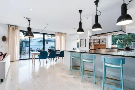 AUSTIN In the heart of central Austin’s coveted Clarksville neighborhood, this 4,784-sqaure-foot home features the modest facade of an original 1938 bungalow, paired with a breathtaking contemporary build-out. Creative sourcing of original materials, pops of color, and superior design are just a few of the ways this gem has gained popularity in the world of Austin architecture. Walk through the front door and experience a journey from traditional charm to modern luxury. The oldworld entryway leads to a bright, spacious kitchen boasting a Bertazzoni range and Euro cabinetry. Step outside the sliding glass doors onto a large deck, ideal for entertaining guests and basking in the area’s natural beauty. This exceptional home pays homage to tradition and redefines modern living. $3,790,000