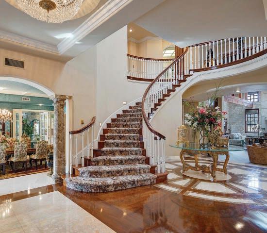 VAUGHAN Over 11,500 square feet of finished space with a private lot backing to protected, mature trees providing amazing scenery. The home is flooded with natural light and features crown moulding, wainscoting, marble flooring in the entrance foyer, and 19-foot ceiling in the main foyer with a stone mantle fireplace in the living room and family room. $4,800,000 CAD