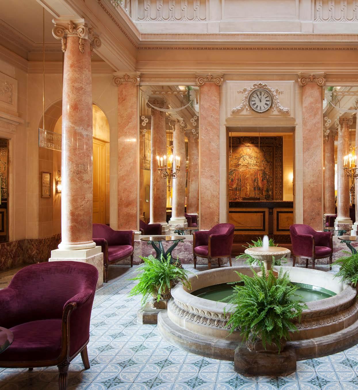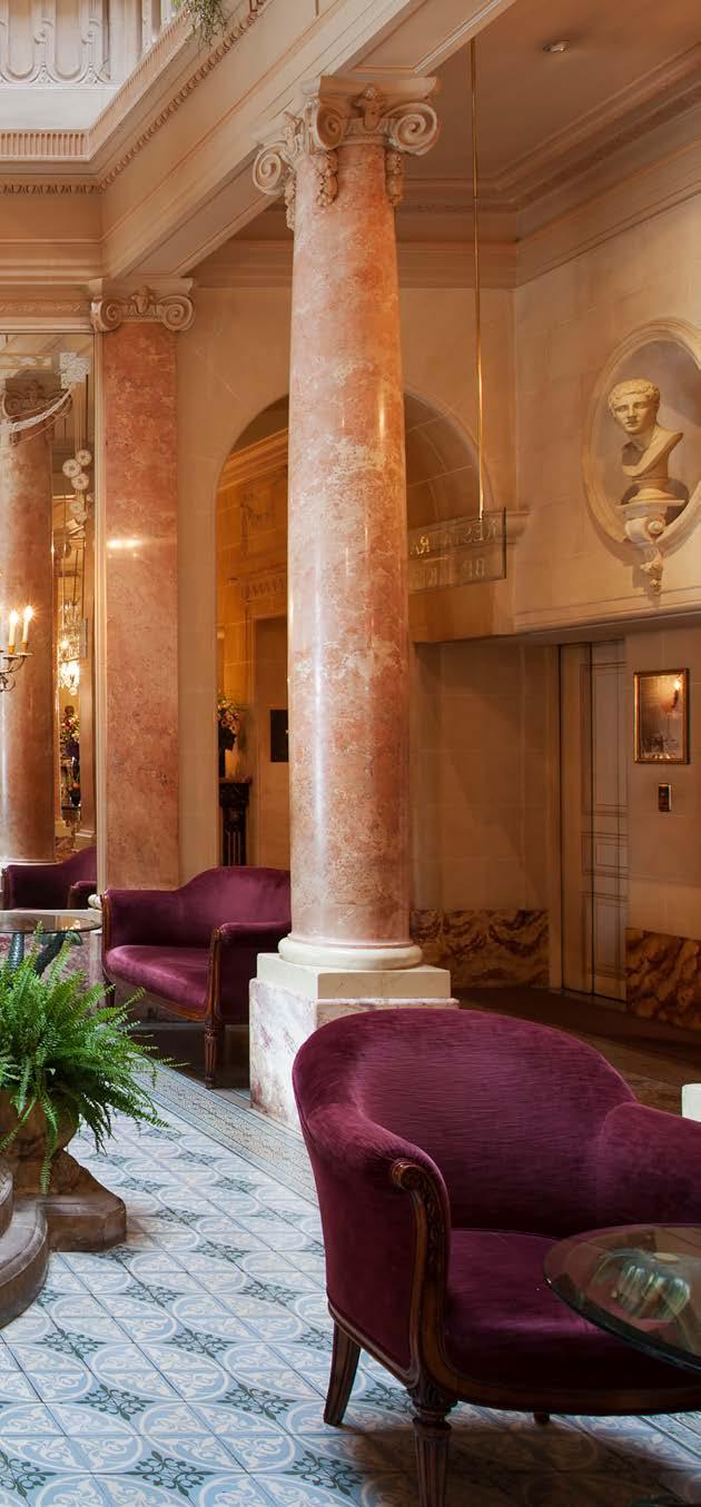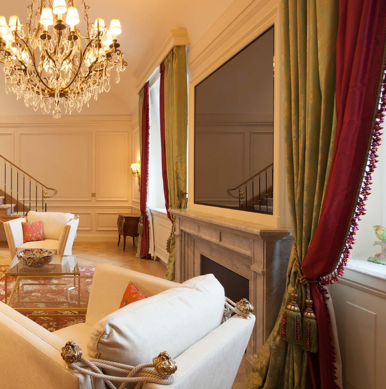 Impressive historic stained glass, made by Enneveux & Bonnet in the early 20th century and carefully stored in the attics, has been restored and placed in the floors of the hotel, highlighted by lavish corridors that serve as its backdrop. For more than 150 years, the family collected and restored rare and exceptional furniture pieces thanks to the talents of the best craftsmen. Walls are covered in the most precious fabrics, while the more intimate private spaces, such as the Salon Masaryk, are fully dressed in rare lemon tree woodwork and original stained glass windows.