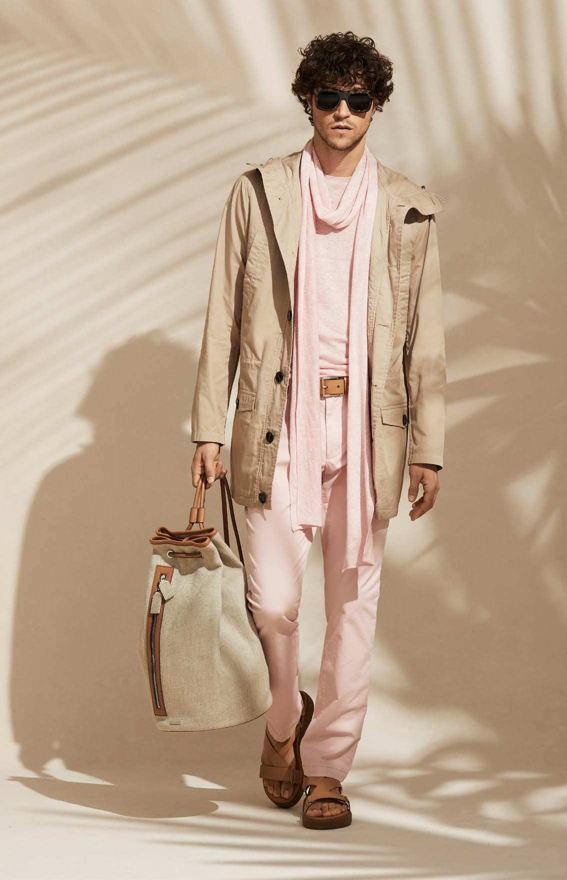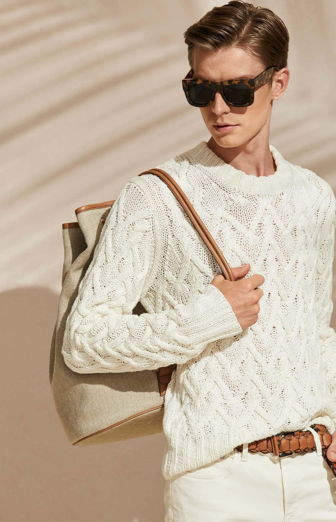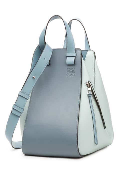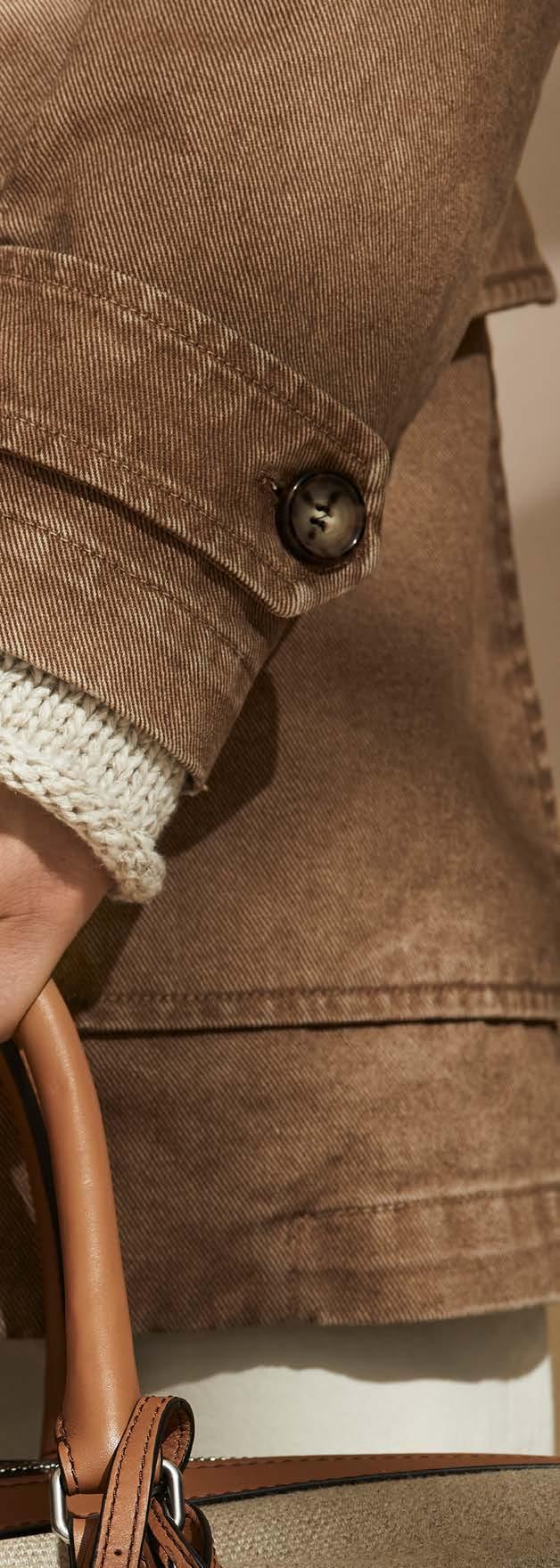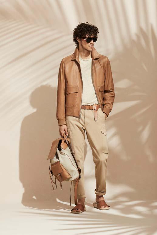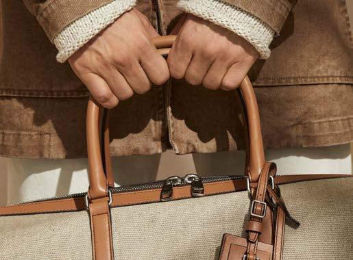 and embroidery. Everyday fabrics are employed in extraordinary ways; jerseys are present and simulated, replicating the ease of a T-shirt in pieces that ingeniously elevate their casual inspiration. Crushed and crinkled surfaces lend a sense of depth, while padding enhances proportion and thought-out details help create movement; a fringed Spanish shawl becomes an abstract dress. The show also introduces two new shapes to join LOEWE’s iconic bags: The Gate, a modern take on a classic saddle carrier featuring a distinctive knot belt and brass hinge, in 2 sizes, and the unlined, reversible Tent bag, seen here in two signature house colours: Oro and caramel.
