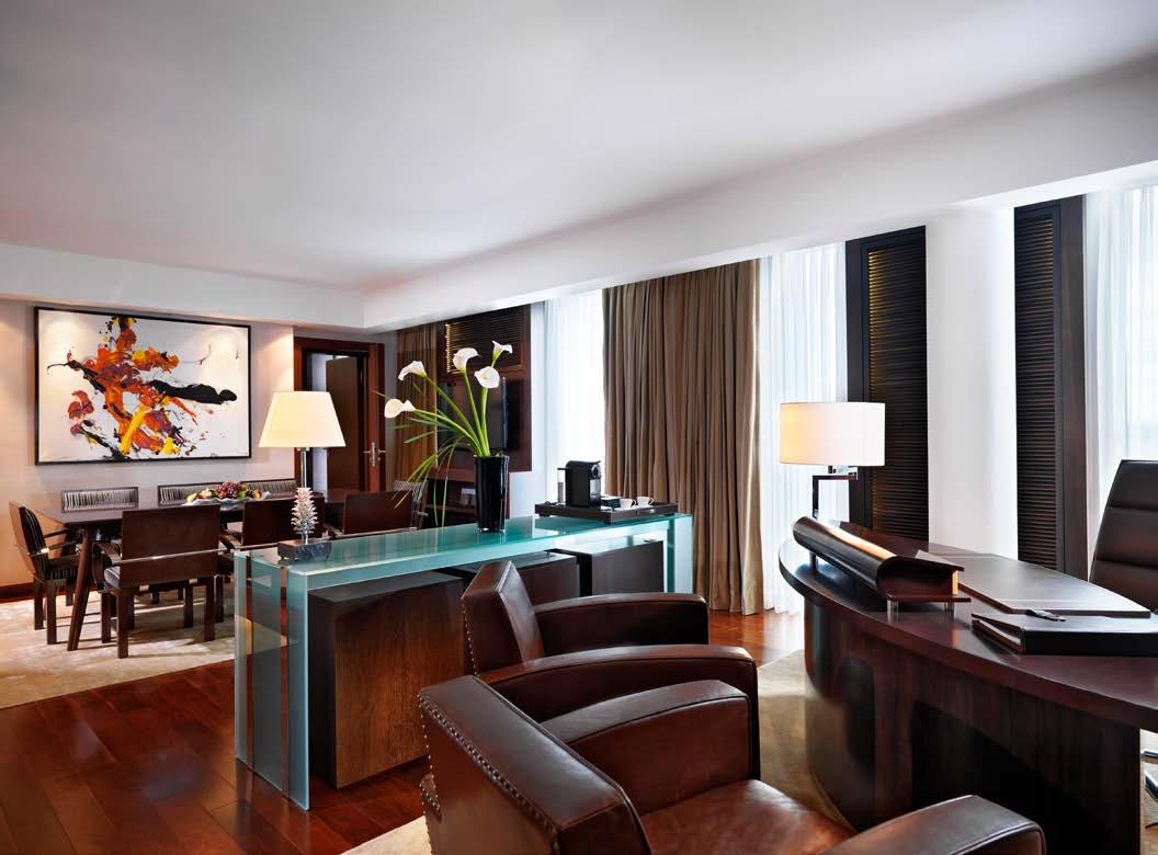 There is only one: The Presidential Suite. This signature suite features a striking skyline view and an incredible sense of space catering for your discerned needs. Experience 220sqm of pure indulgence and entertain lavishly in the most sophisticated way. A beautifully appointed master bedroom with private bathroom, sauna and dressing room, and sumptuously laid out working and living areas including fire place, offer an unforgettable experience. A 2nd bedroom with sitting area and private bathroom, a separate guest bathroom and a pantry kitchen with external entrance complete the facilities. The private sauna is a true highlight and a guest room with bathroom and seating area assures pure privacy in a shared environment.