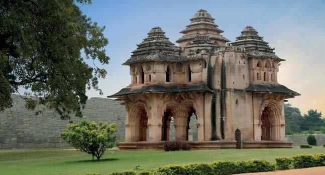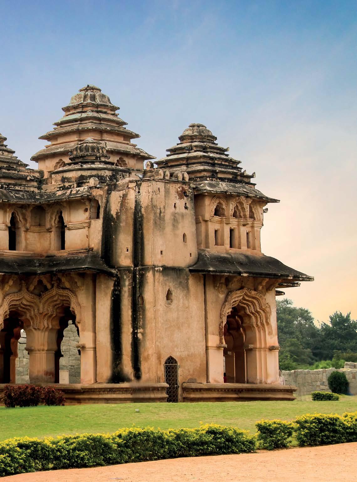 If opulence can be expressed in stone, then there is no better example than the Royal Enclosure, which was the seat of power of the Vijayanagara Empire. In its heyday, the enclosure used to house 45 buildings, including the royal courts, tanks, temples and subterranean chambers. Blending south Indian and Mughal styles, the enclosure has three portals—two in the north and one in the west. The palaces rest on granite platforms and they face either the east or the north. The platforms are decorated with flowers, geese, demon faces and human figures. The craftsmen of those days extensively used granite and soapstone to make these edifices.