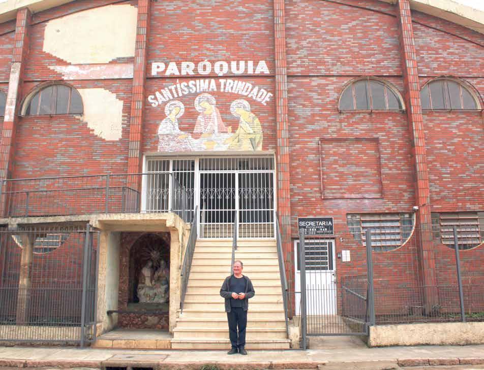 Pe. Vicente em frente à paróquia: com três metros de altura, a edificação salvou a vida de muitas pessoas e animais durante a enchente de maio