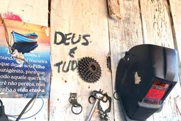 sua casa, no perímetro da ocupação, a oficina onde Cristiano trabalha é outra prova de resiliência em sua história. Ele conta que, na época das inundações de 2024, perdeu praticamente todo o material que possuía. “O que consegui salvar foi só um disco de cortar ferro”, aponta. Determinado a seguir trabalhando, demorou somente dois meses para reconstruir o espaço sozinho, utilizando apenas equipamentos encontrados na rua: “As ferramentas vêm tudo do lixo. Todas elas. Não tem uma que é comprada. No início, eu tinha só umas cinco chaves. Comprei cola, remendo e uma bomba e comecei assim, para ganhar o pão da família”. Além dos utensílios e acessórios necessários para o dia a dia, também é possível observar no local algumas frases que fazem referência a sua fé cristã, como "Deus é