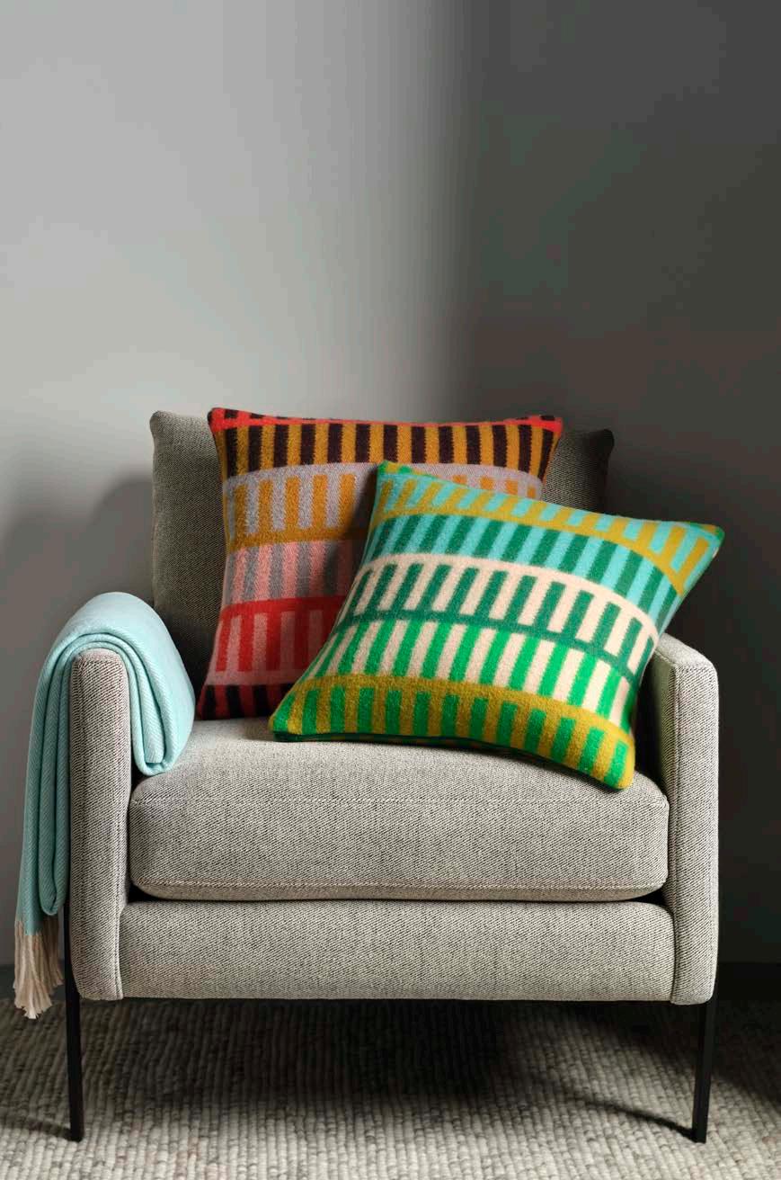 The striped Shiel Pillow Covers by Donna Wilson bring whimsical color combinations to sofas, chairs and beds. Each one is woven in a heritage mill in the north of Scotland using ultrasoft lambswool.