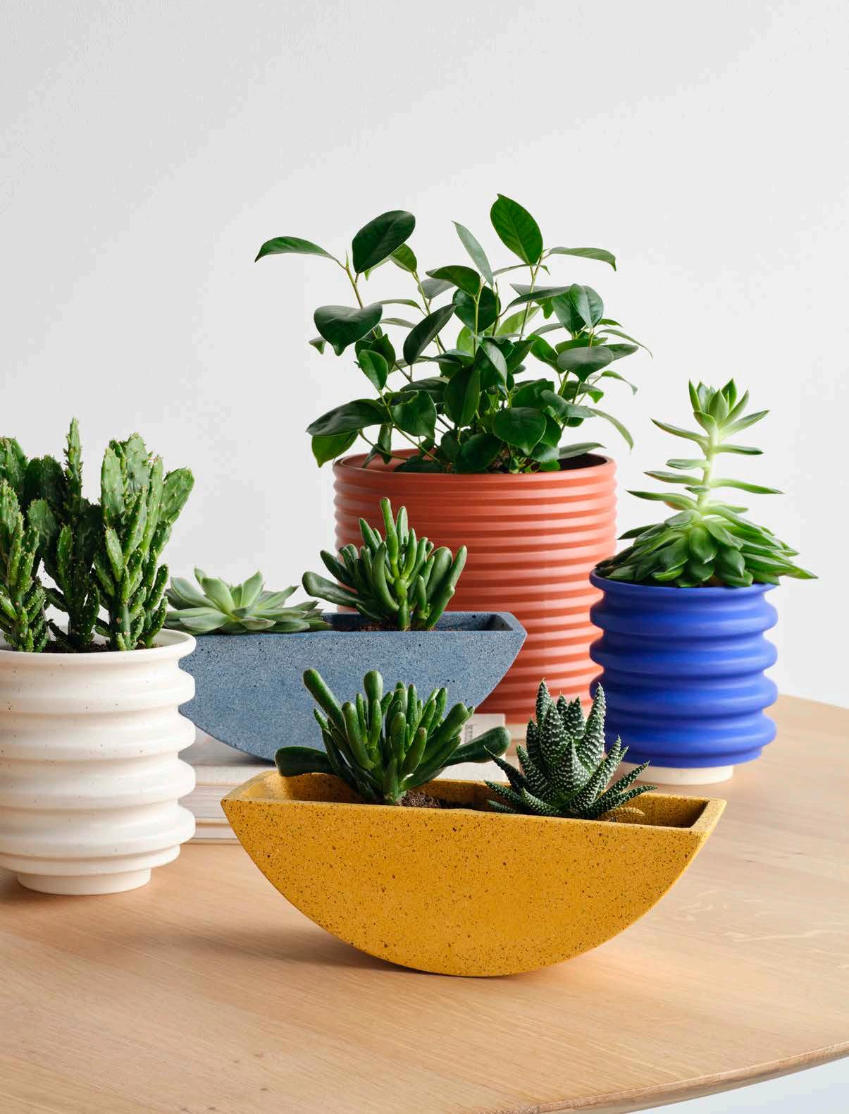 The Block and Totter Planters instantly upgrade house plants with vibrant colors and distinctive shapes. The modern, geometric forms create striking contrasts with the natural silhouettes of flowers and foliage.
