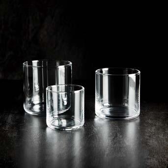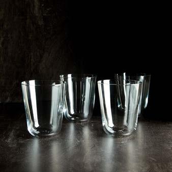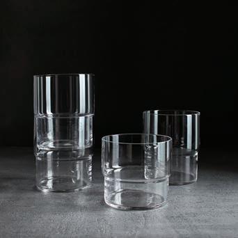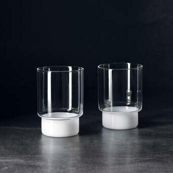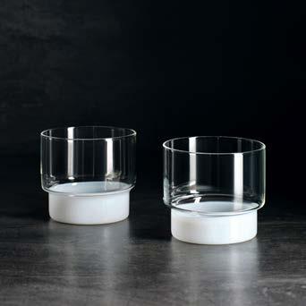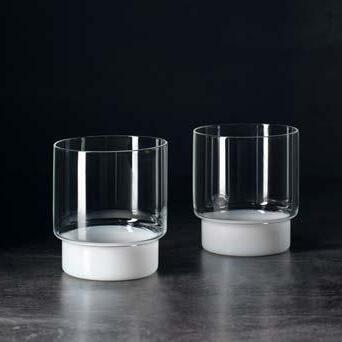 Rye Glasses and Tumblers feature graphic shapes with a subtle accent of opaque white glass at the base. Each lightweight, durable vessel includes a step detail that allows for seamless stacking.
