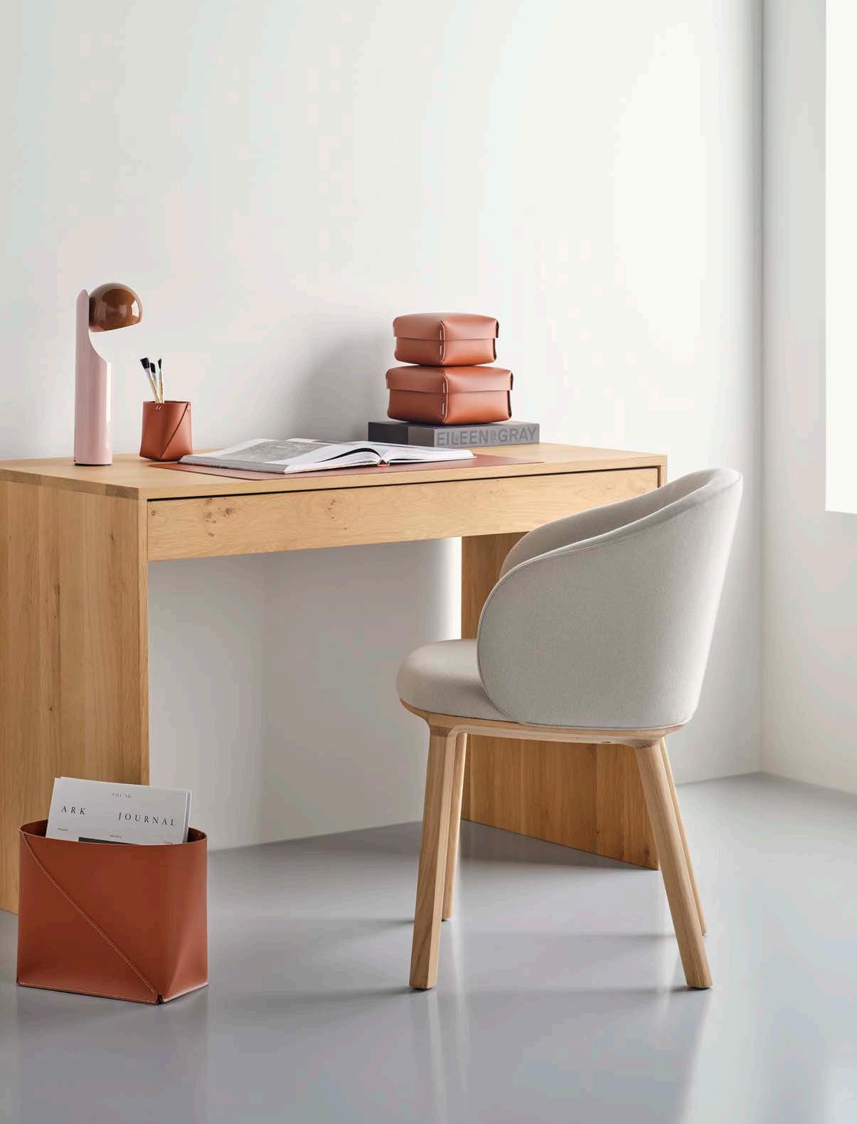 stands out with its rounded shape and sophisticated piping. This comfortable desk, dining or accent chair features Oeko-Tex-certified Italian fabric upholstery.
