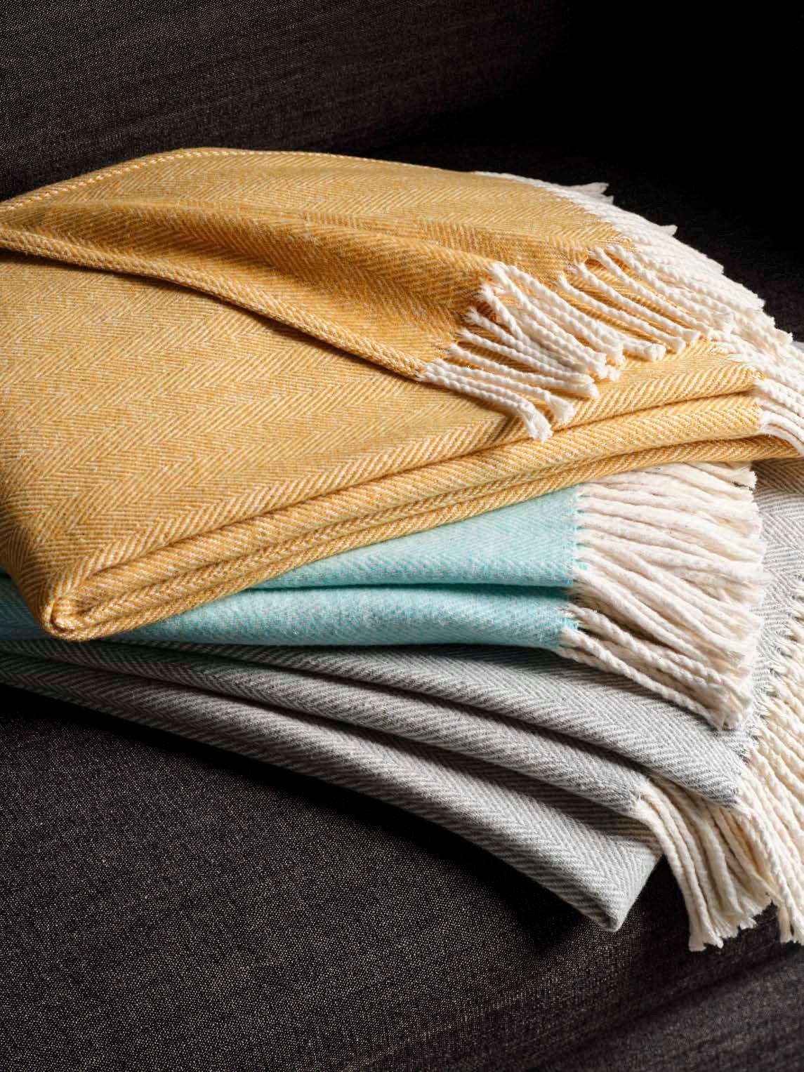 Made of 100% brushed cotton, the luxuriously soft Herringbone Throw looks and feels like cashmere but has the easy-care benefits of cotton. Choose from three subdued colorways— Goldenrod, Seaglass or Cloud—for this generously sized blanket.