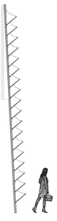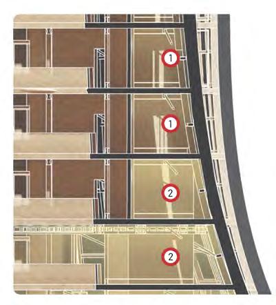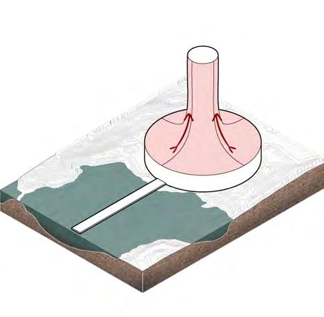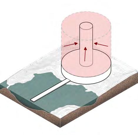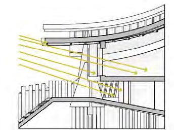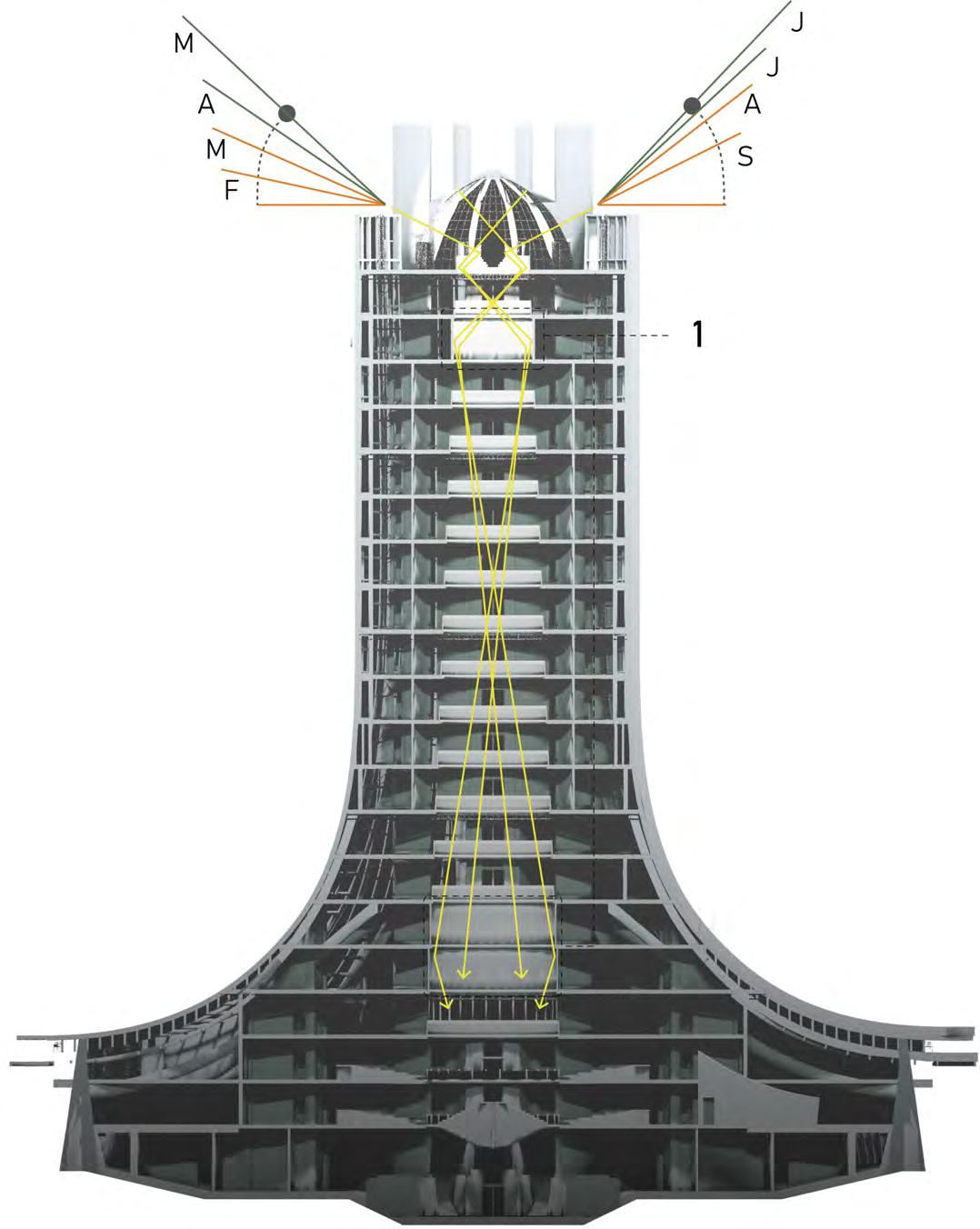 The lantern is situated at the top of the tower (1) due to amount of heat generated (up to 100oC). To regulate temperature and keep plant equipment safe, cool air will circulate from the plant room (2) and escape through roof vents (3). The lantern provides many functions such as an internal light source (4), a passive heating system (5), an indication of location for people travelling during dark months (6), and a counterweight (7). A buffer zone has been installed to regulate light paths and temperature (8), ensuring an optimal internal environment further down. Maintenance of plant and lantern will only be carried out when the lantern is off.
