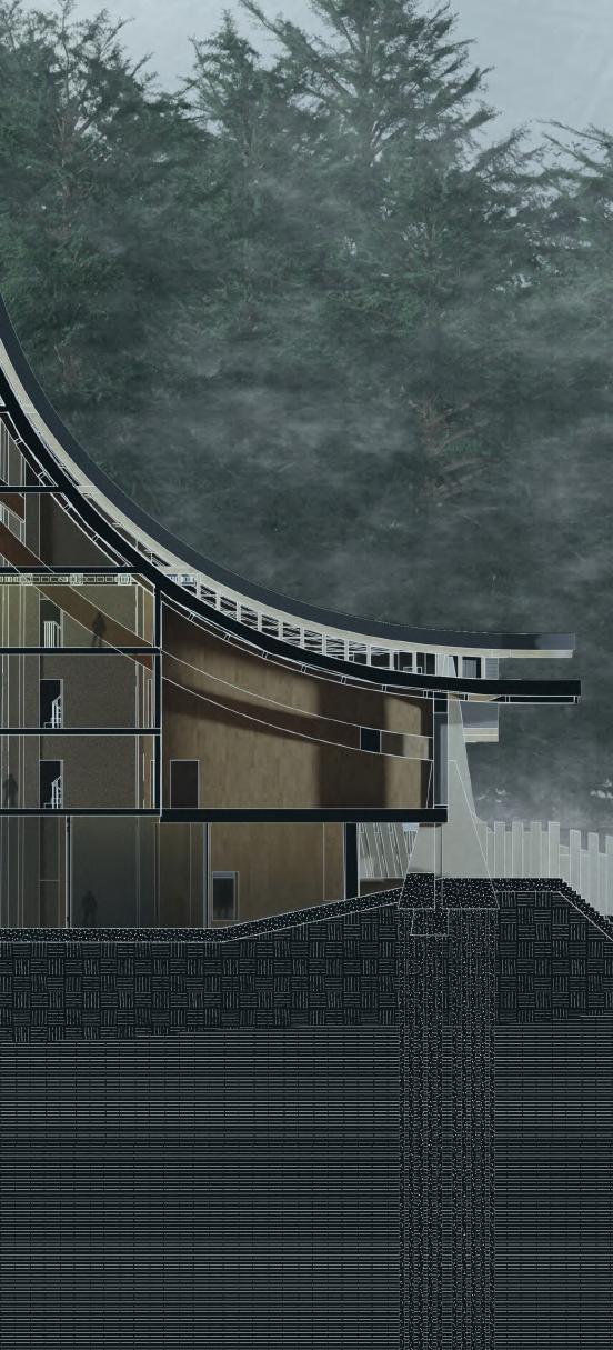 The new government cloister’s construction will lead through example, using techniques that will allow it to function within a region of permafrost and extremely harsh environment. The building will promote CLT as a new modern method of construction for the region due to the abundance of coniferous trees. A new CLT factory will be constructed for the purpose of the cloister and urban building in the future. It will also pioneer as a self efficient system, harnessing the raw power and resource of the Siberian taiga for its progression as a renewable state approaching the latter half of the 21st Century. Although a harsh landscape in the current milieu, Siberia will become the world’s new economic powerhouse within our lifetime due to global rising temperatures.