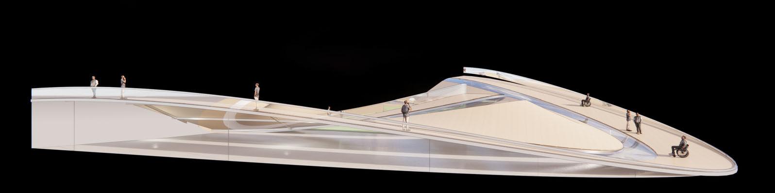 The profile of the monocoque roof will create strong uplifts with a consistent laminar flow of south-west prevailing winds; this must be mitigated to avoid vertical deflection of the catenary member. Earth berms, vortex shedding and passegways are used as mitigation strategies.