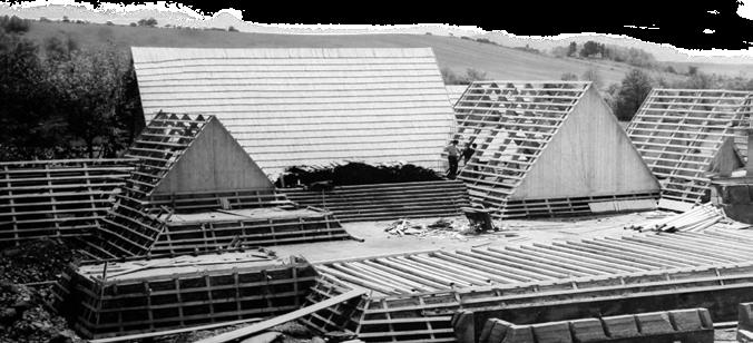 Oak frame structure put together with half and cross lap joints, reinforced with timber nails and dowels. Nature of system allowed for disassembly