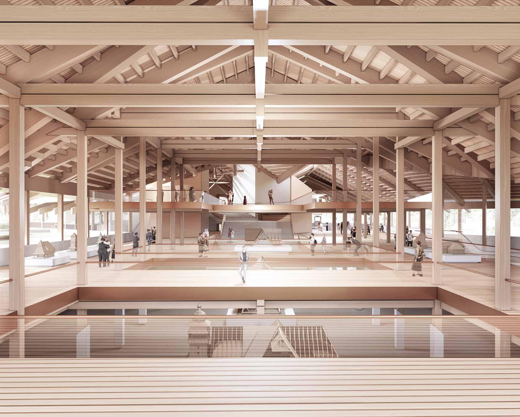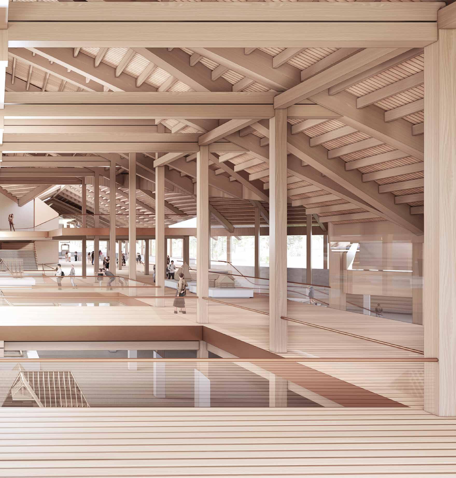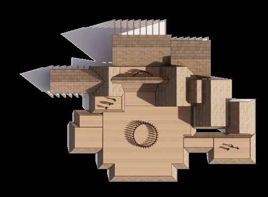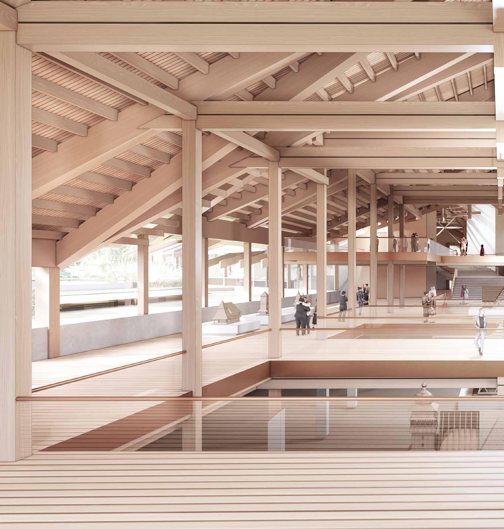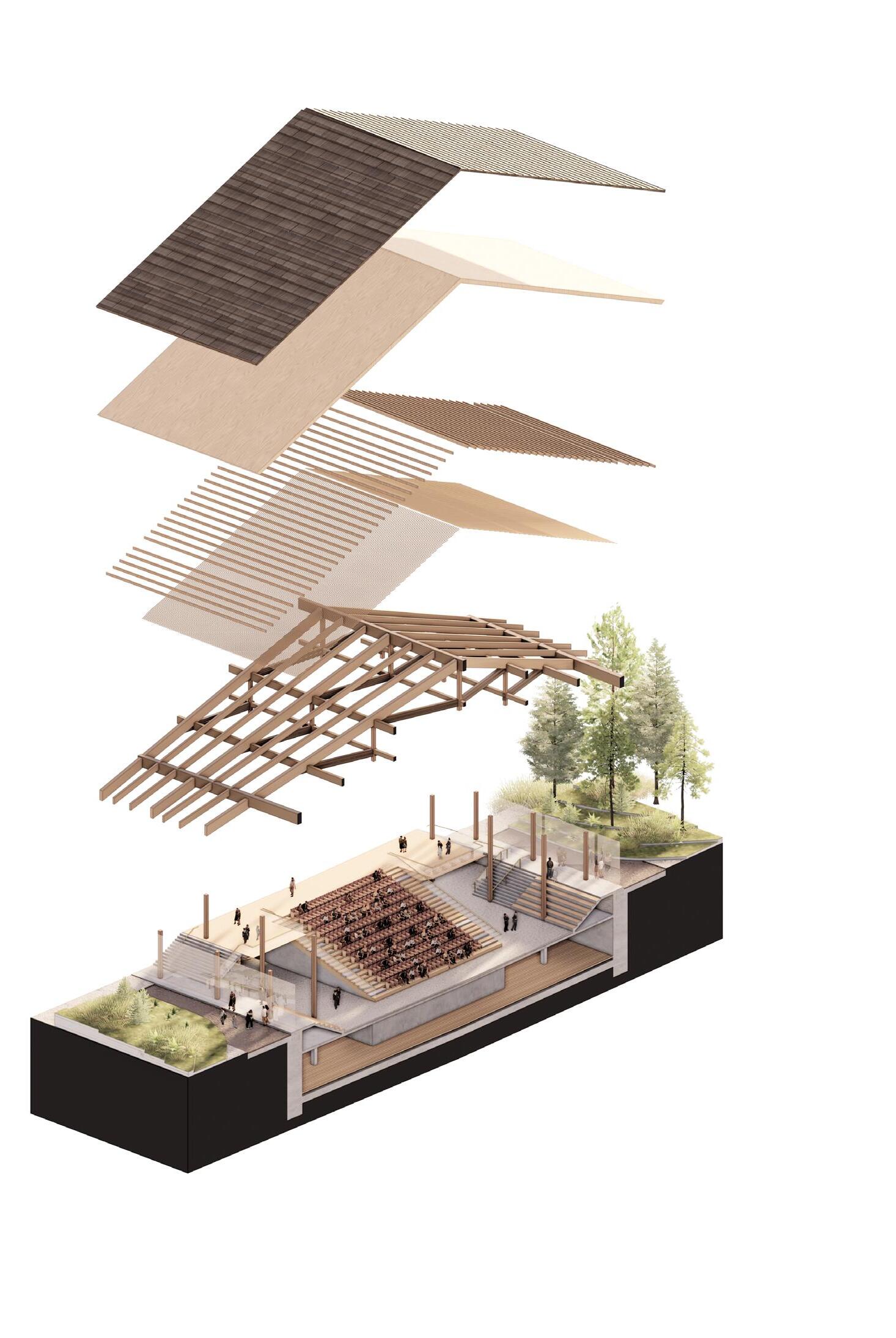 The suspended posts within the truss system create a depth to roof structure resembling that of an attic in traditional folk construction. Typically used as storage, and not directly accessible, the proposal twists the idea of the attic and gives it new life, becoming almost a memory palace - a museum of the disappearing folk construction techniques.