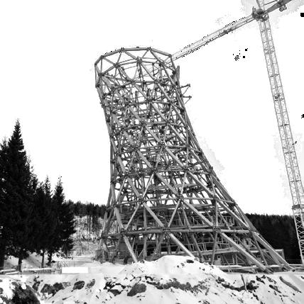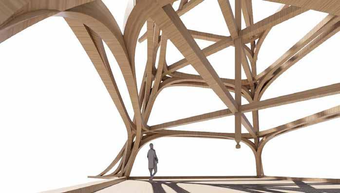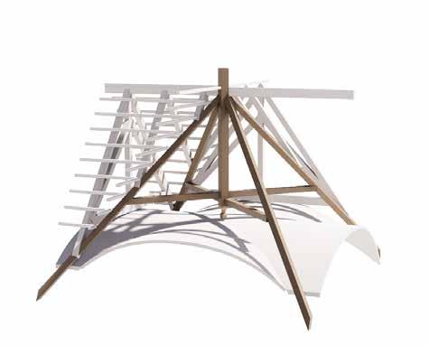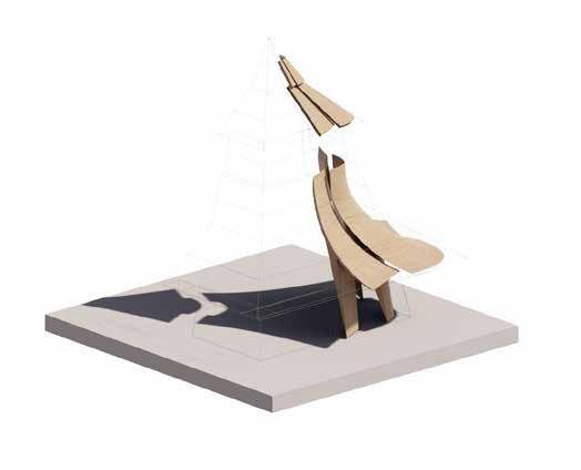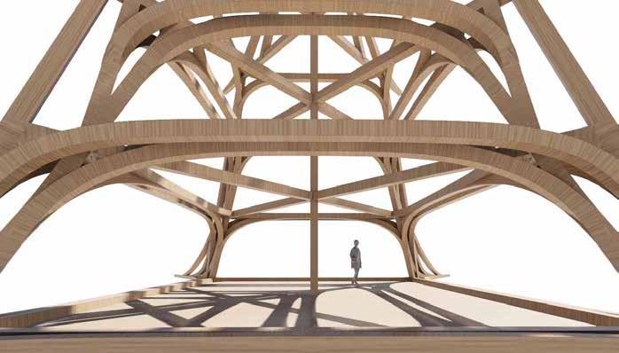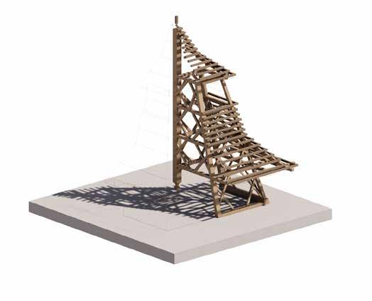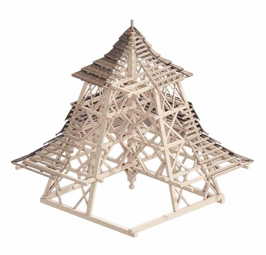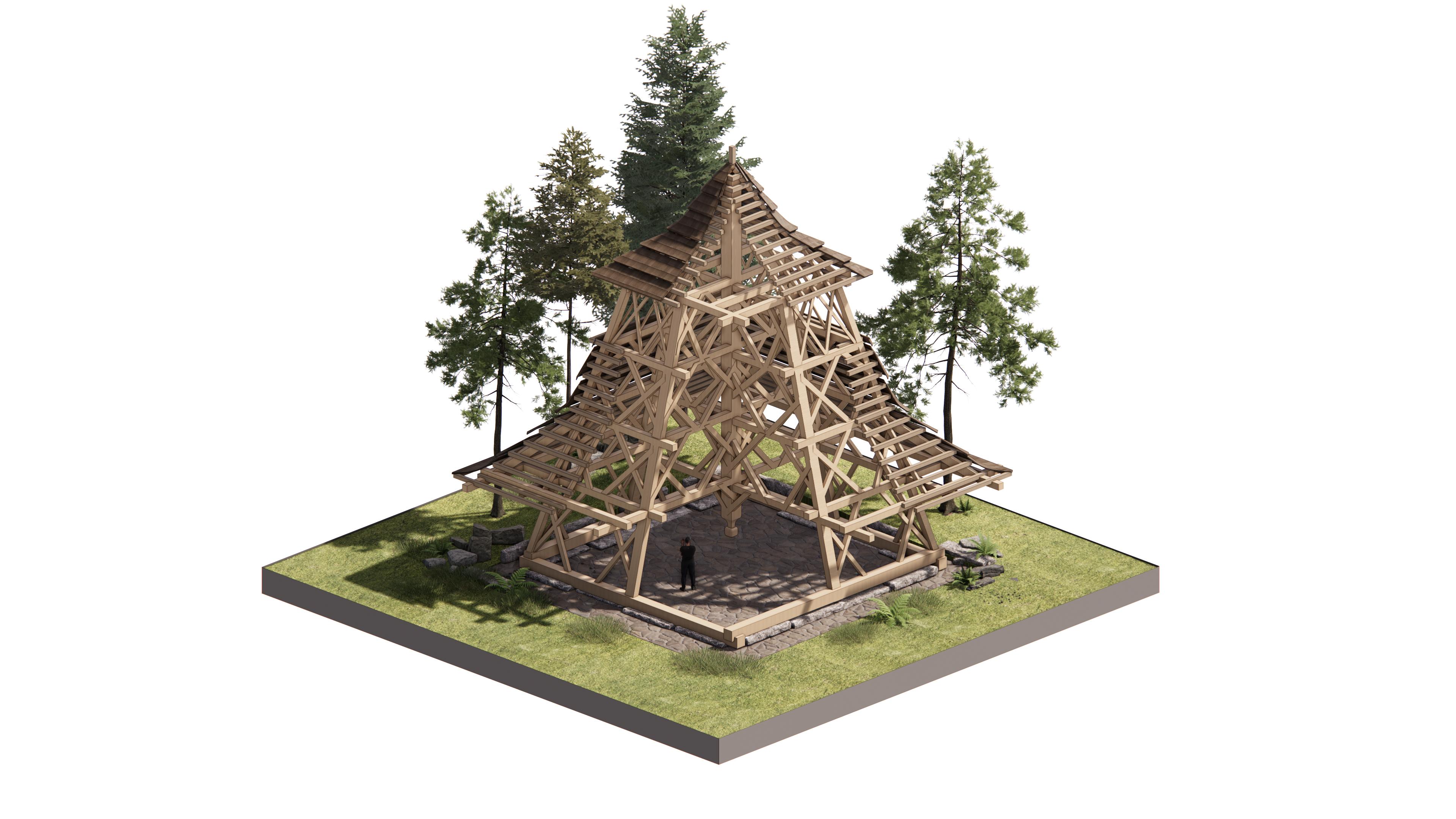Speculation envisioning the space of the Male Ozorovce bell-tower “reframed” using contemporary lamination techniques in which multi-directional structural components converge, opening up the central space.