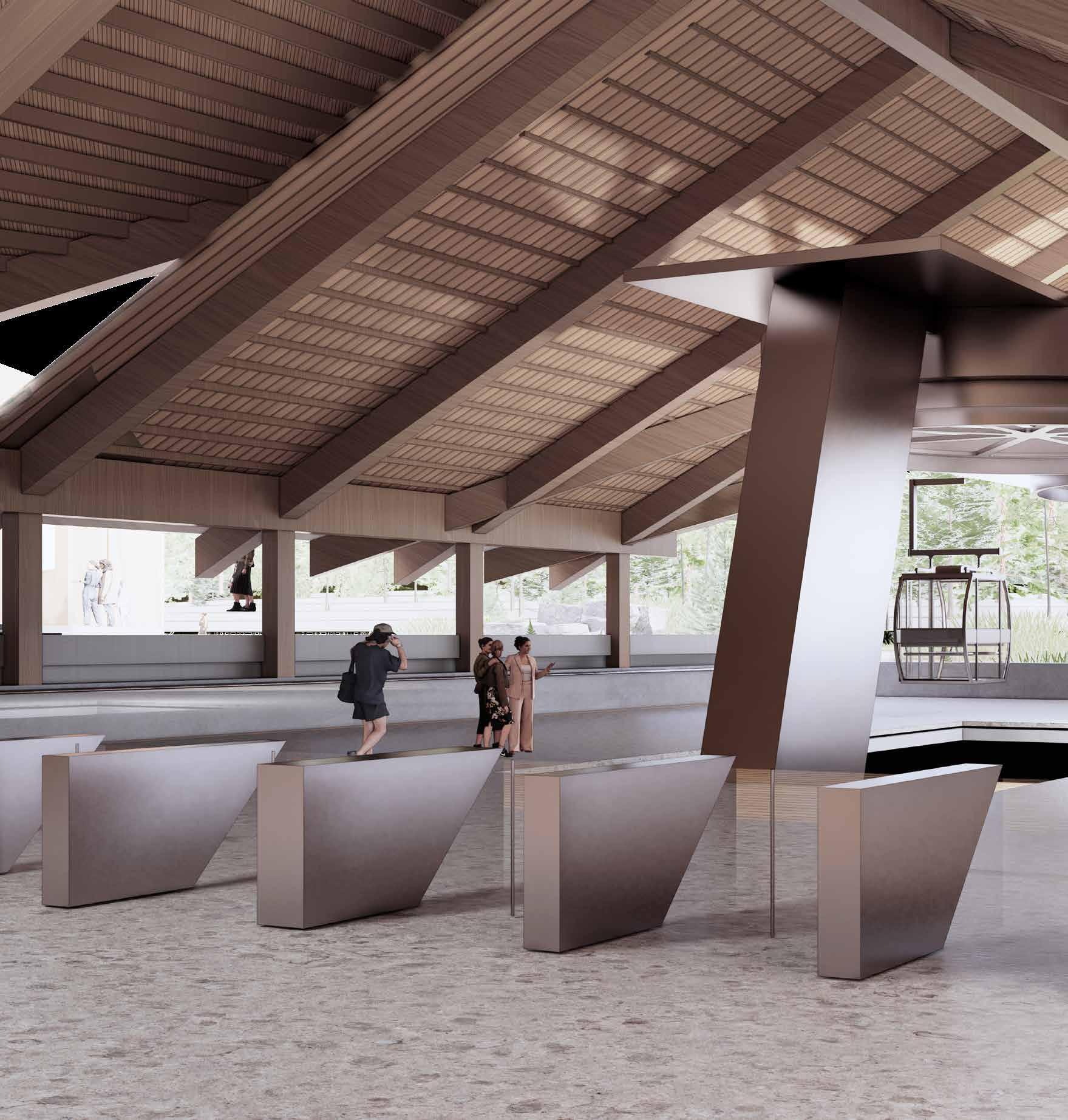 Central space and structure marking directs flow from station towards cable-car and deeper, towards the performance hall.
