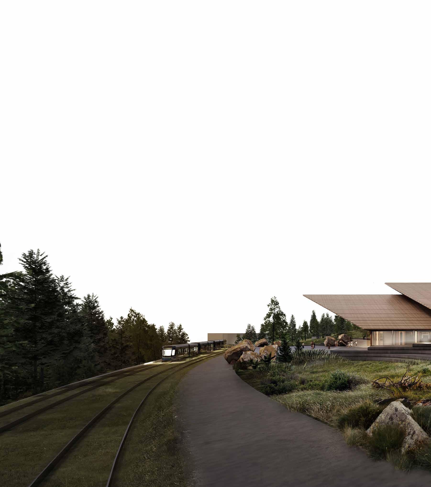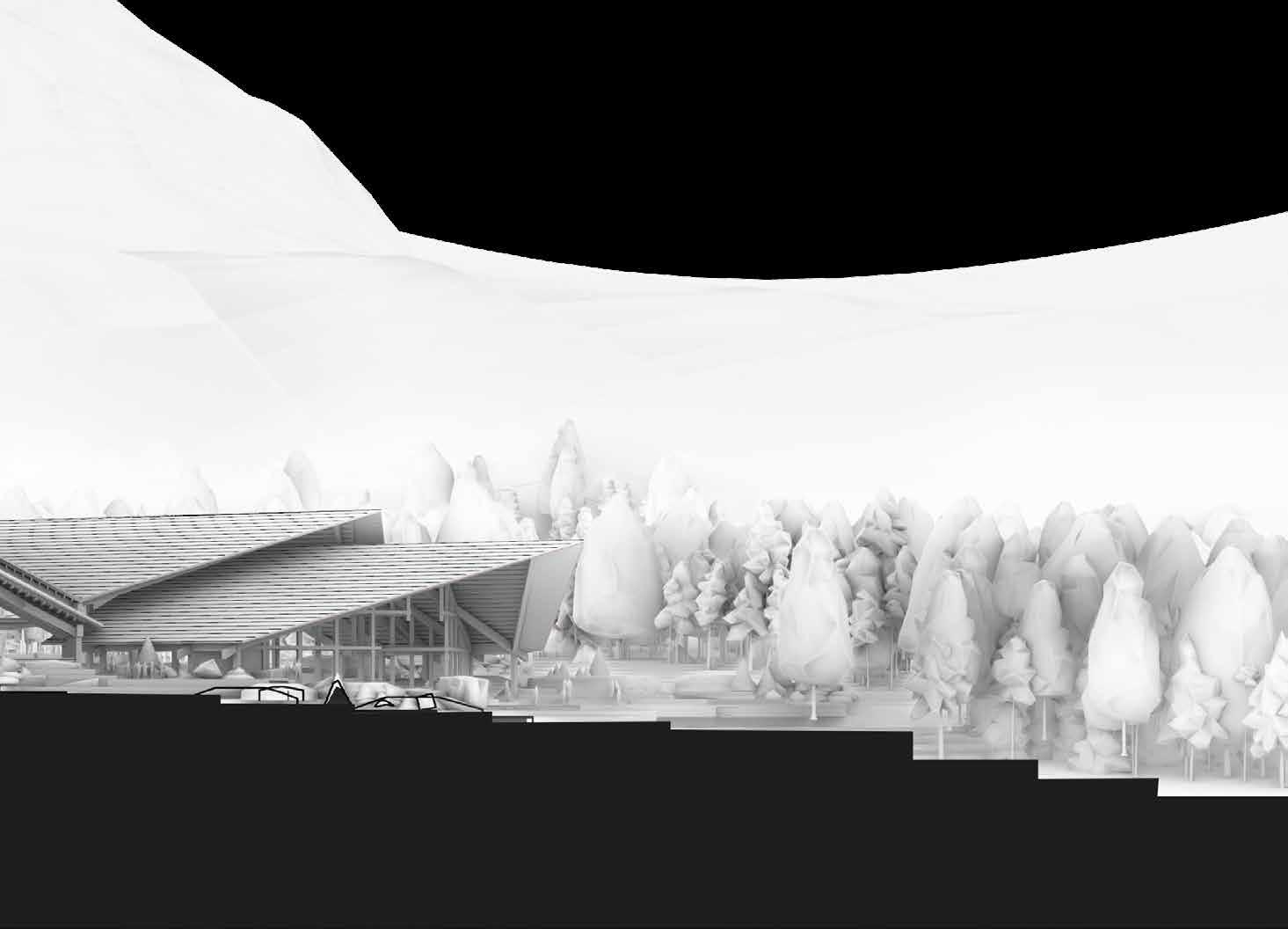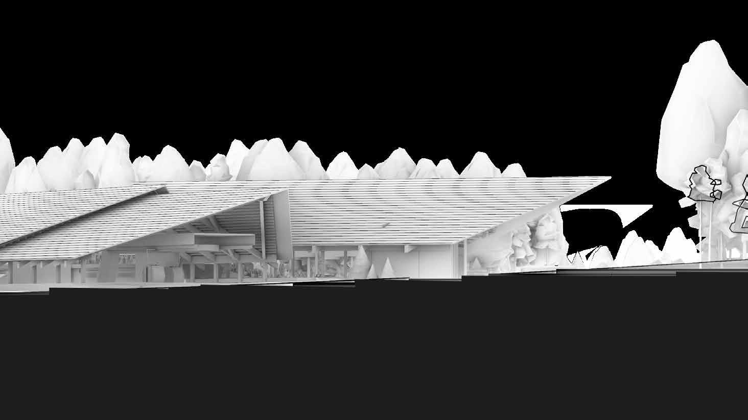 The massing is composed of two main axis – the rack-railway to cable-car interchange station in one, and folk performance venue and museum in the other. The programme arrangement of the