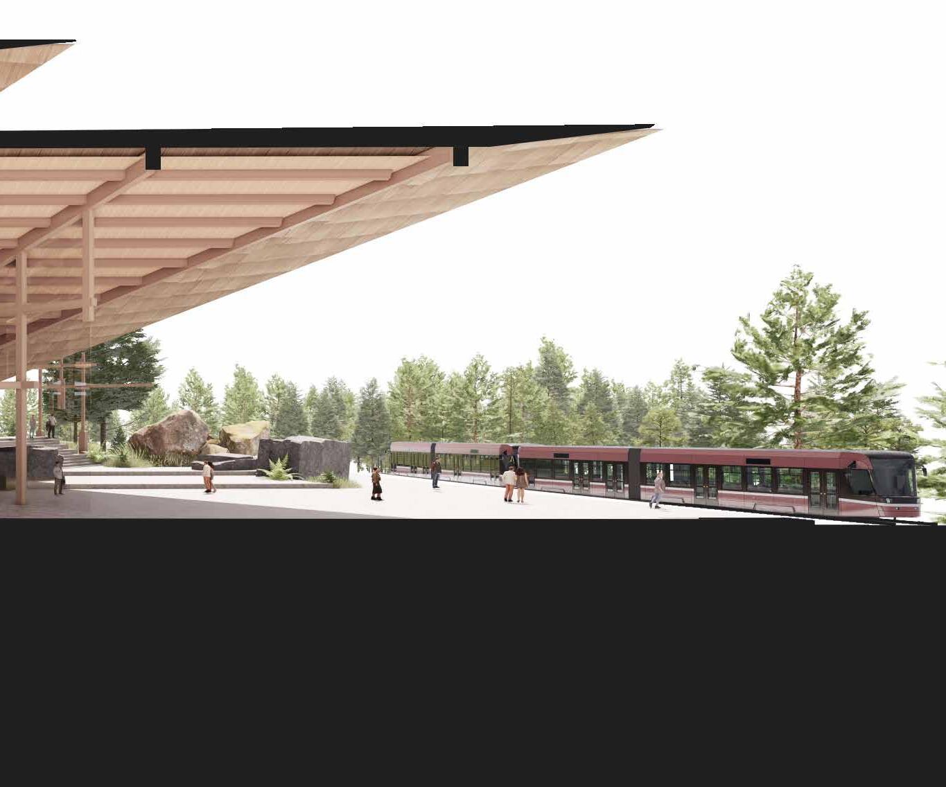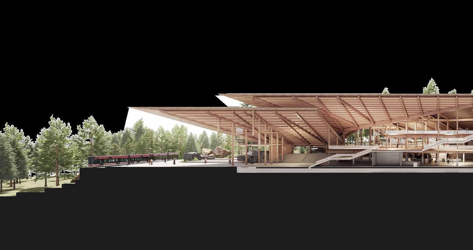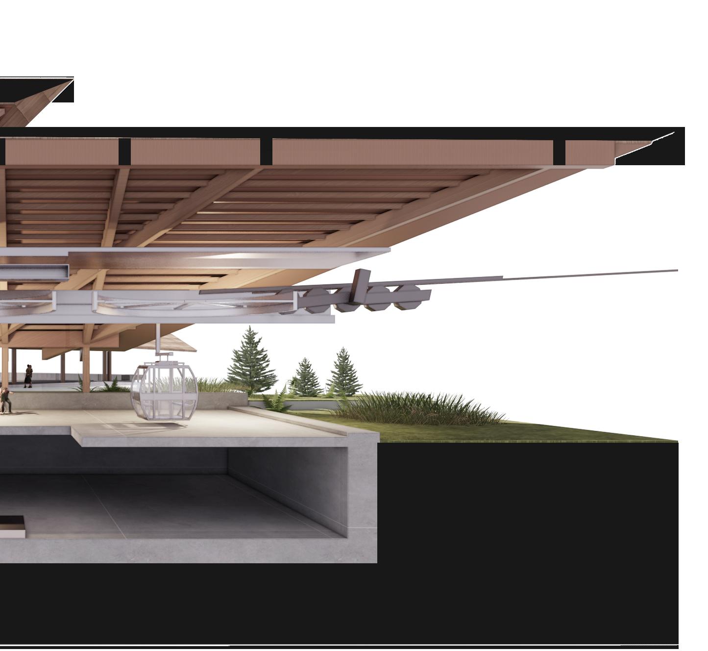 The massing is composed of two main axis – the rack-railway to cable-car interchange station in one, and folk performance venue and museum in the other. The programme arrangement of the