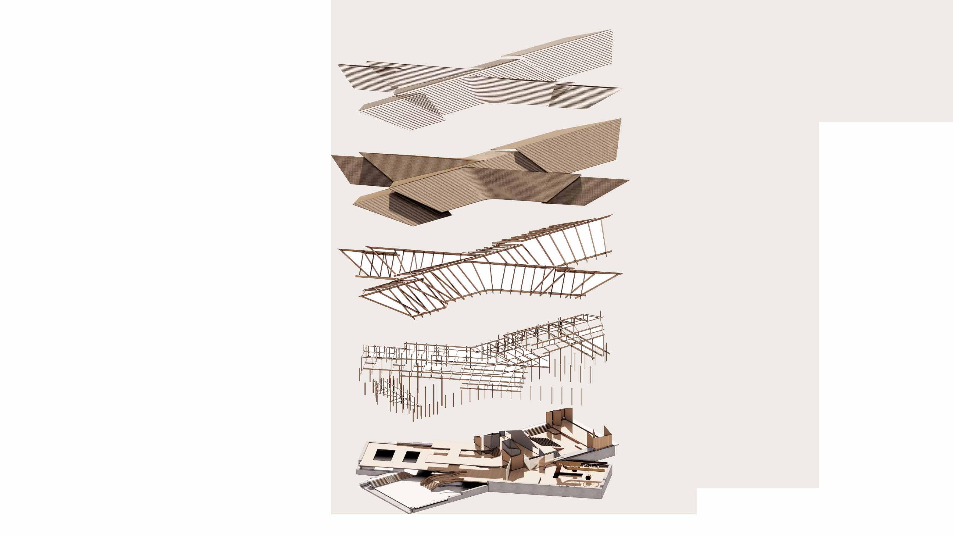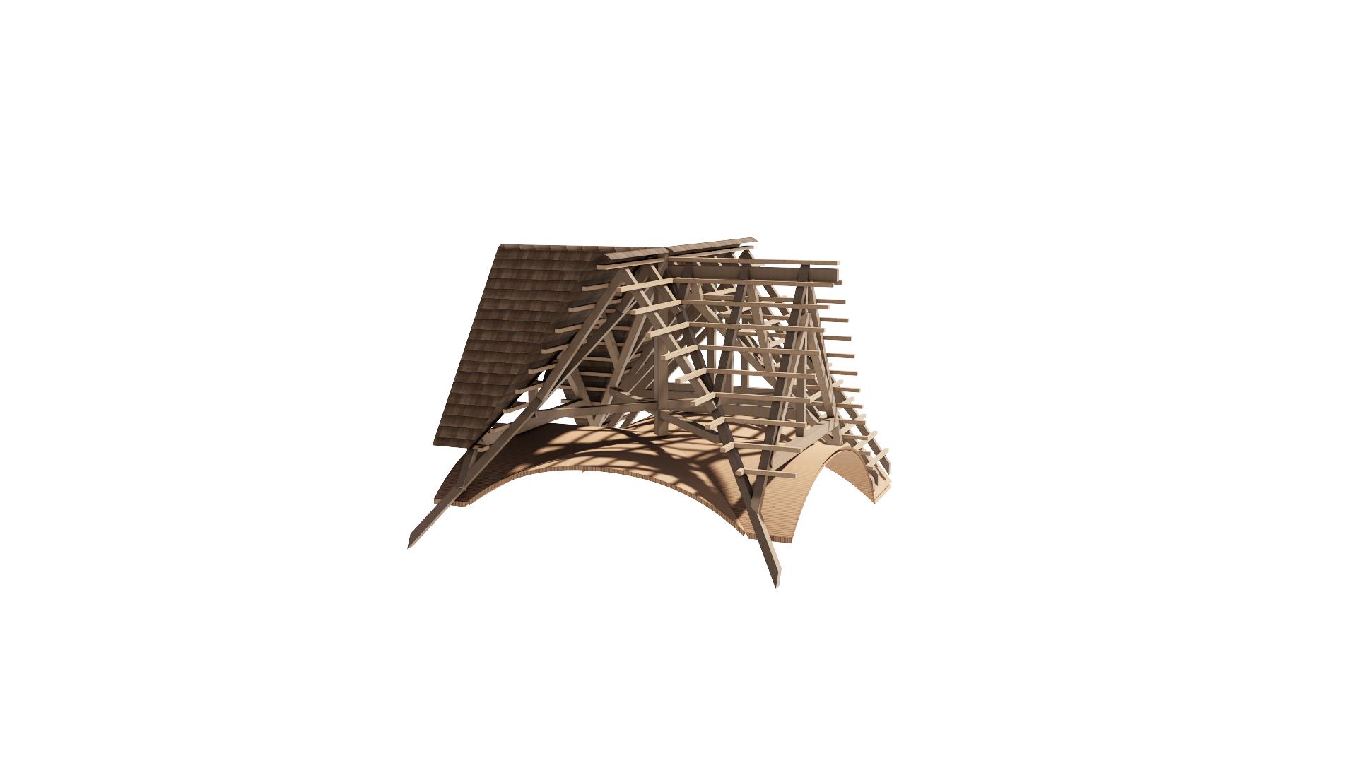 Structural speculation exploring the fusion of components, specifically structure of level and roof support. Form following or tracing load paths and grain directions of components.