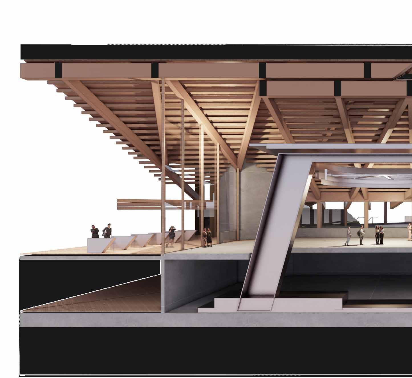 Roof Structure Roof beams cross-lapped onto suspended post and primary columns at the perimeter of the hall