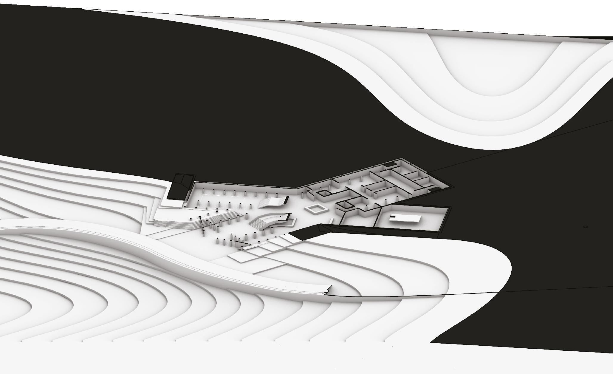 main axis creates a linear procession up through the building, from main entrance, through the exhibition areas to the performance venue. Two secondary axes diverge from the central space, first the exhibition areas and second, the cable-car station.