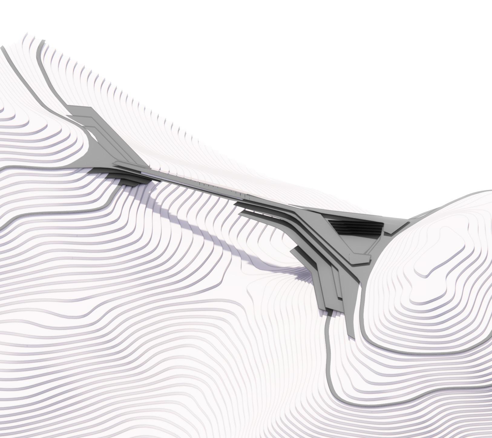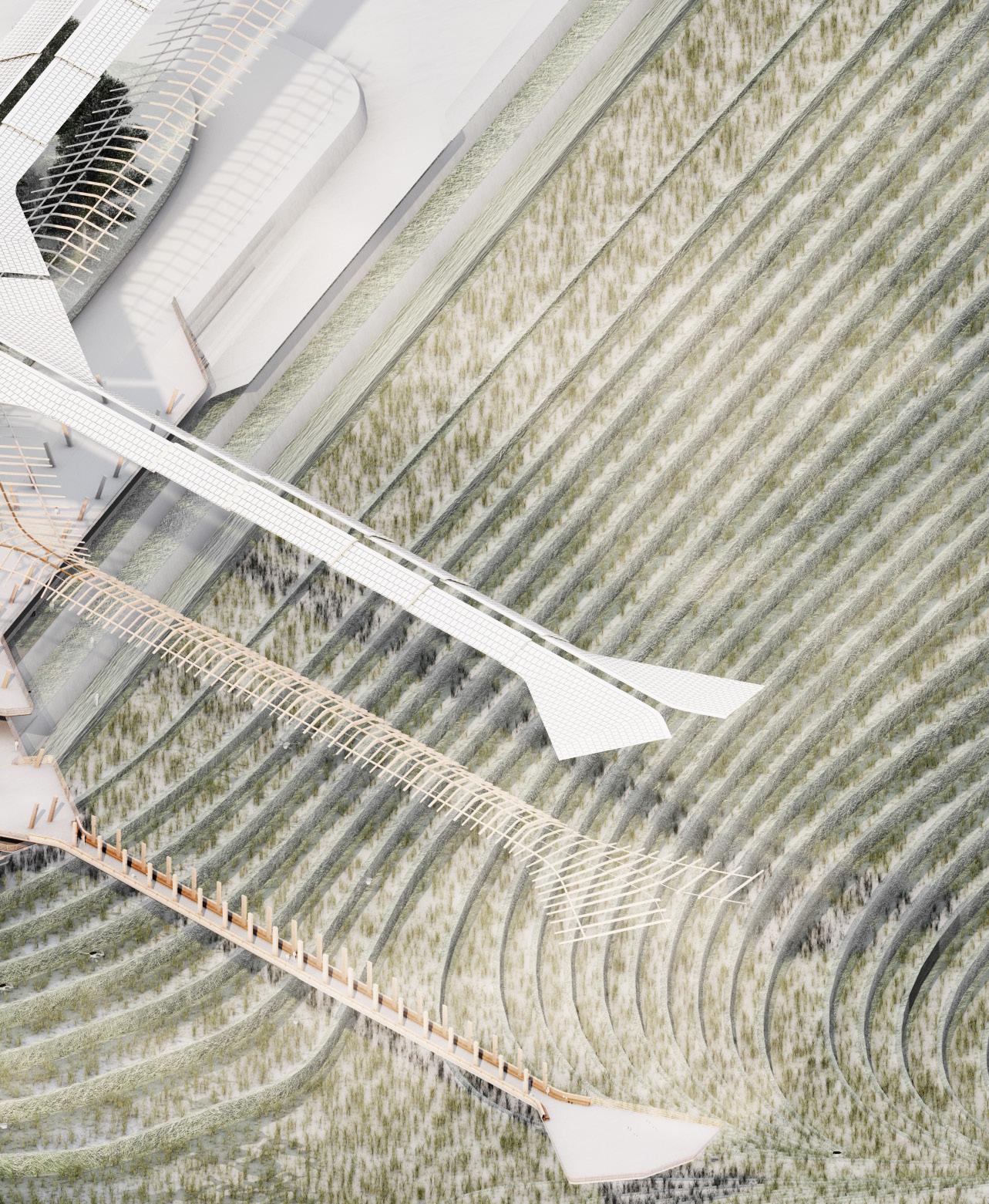 Inspired by the natural contours of the mountainous terrain, the architecture features dynamic floor plates that extend from the slopes, creating a seamless connection between the built environment and the surrounding landscape. A footbridge spans between two mountain peaks, creating connectivity and unity within the community.