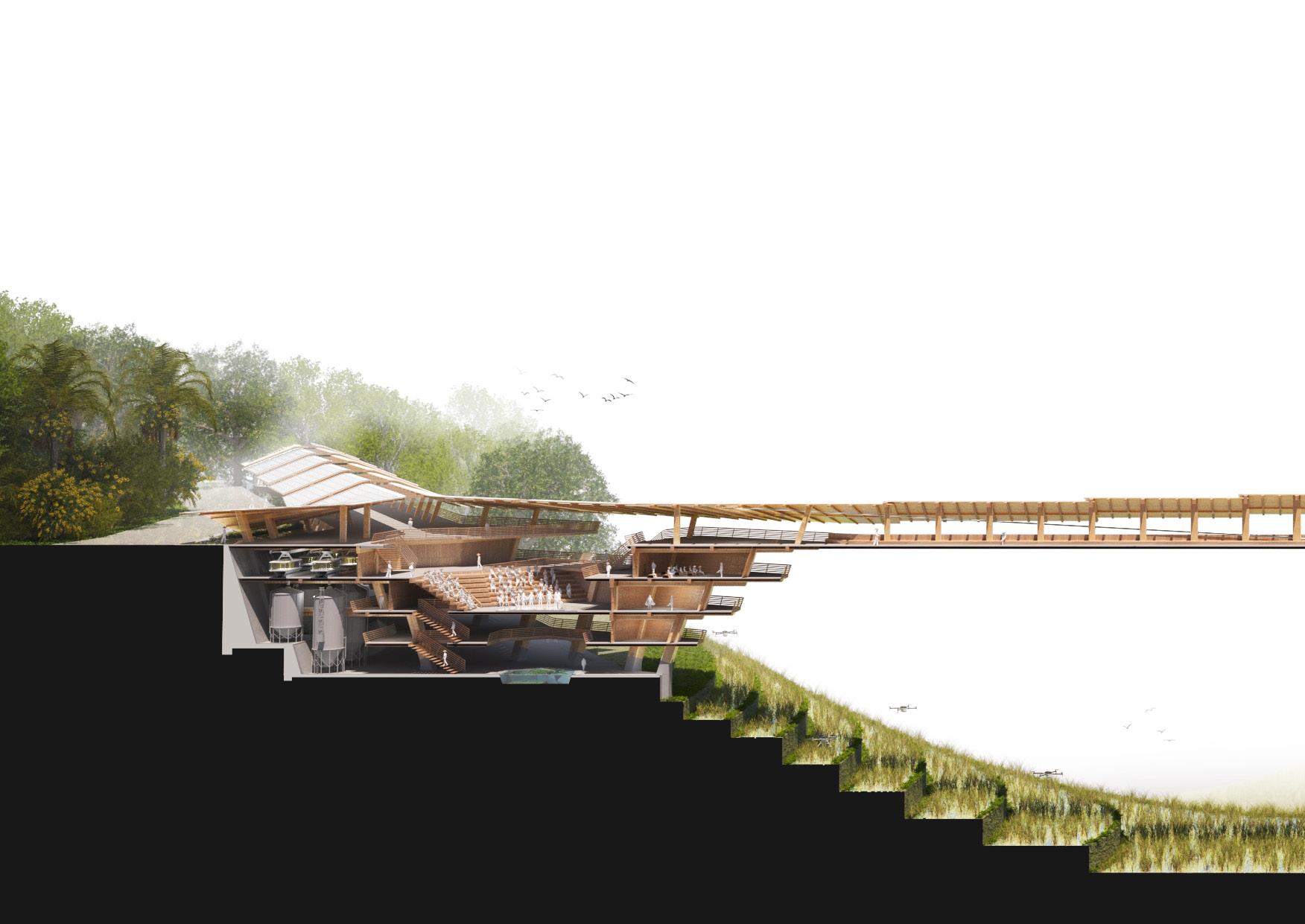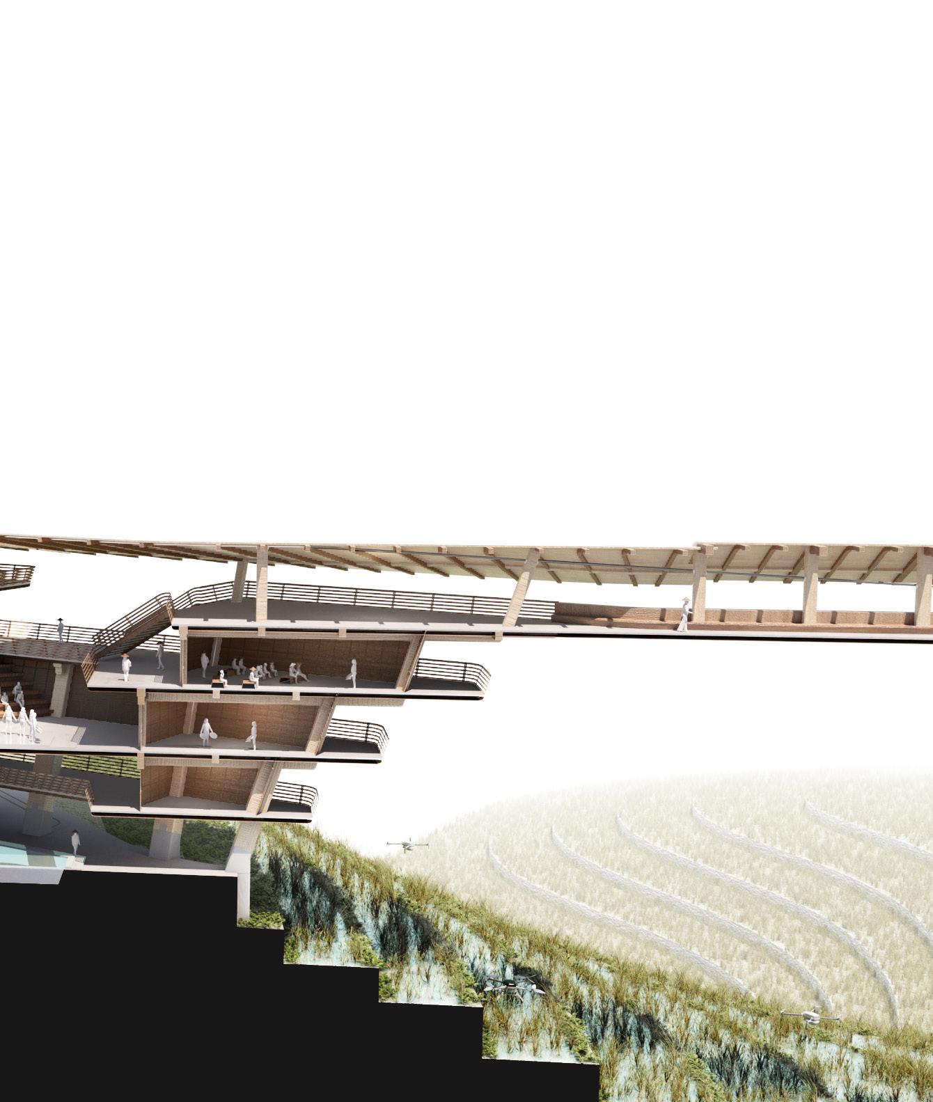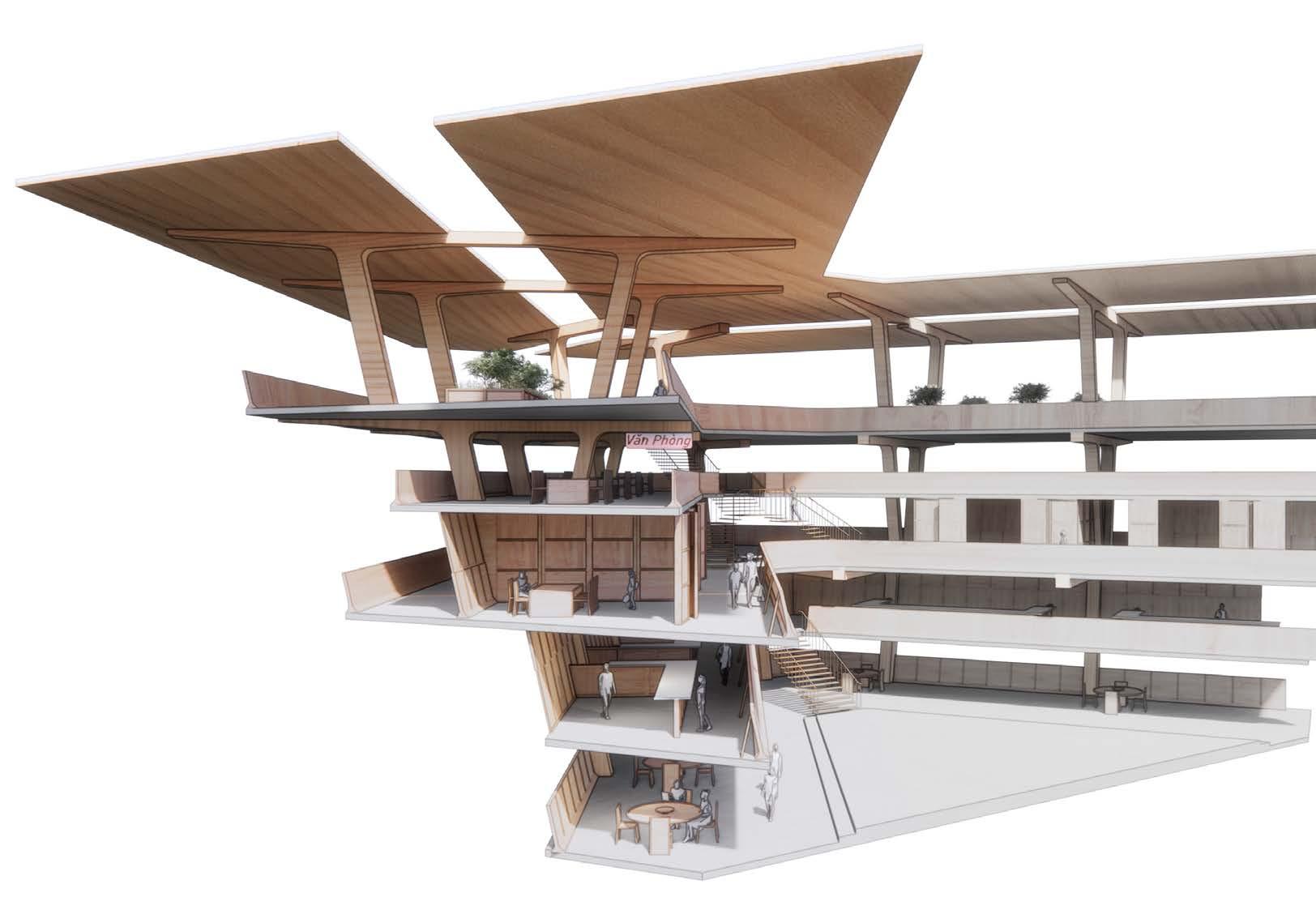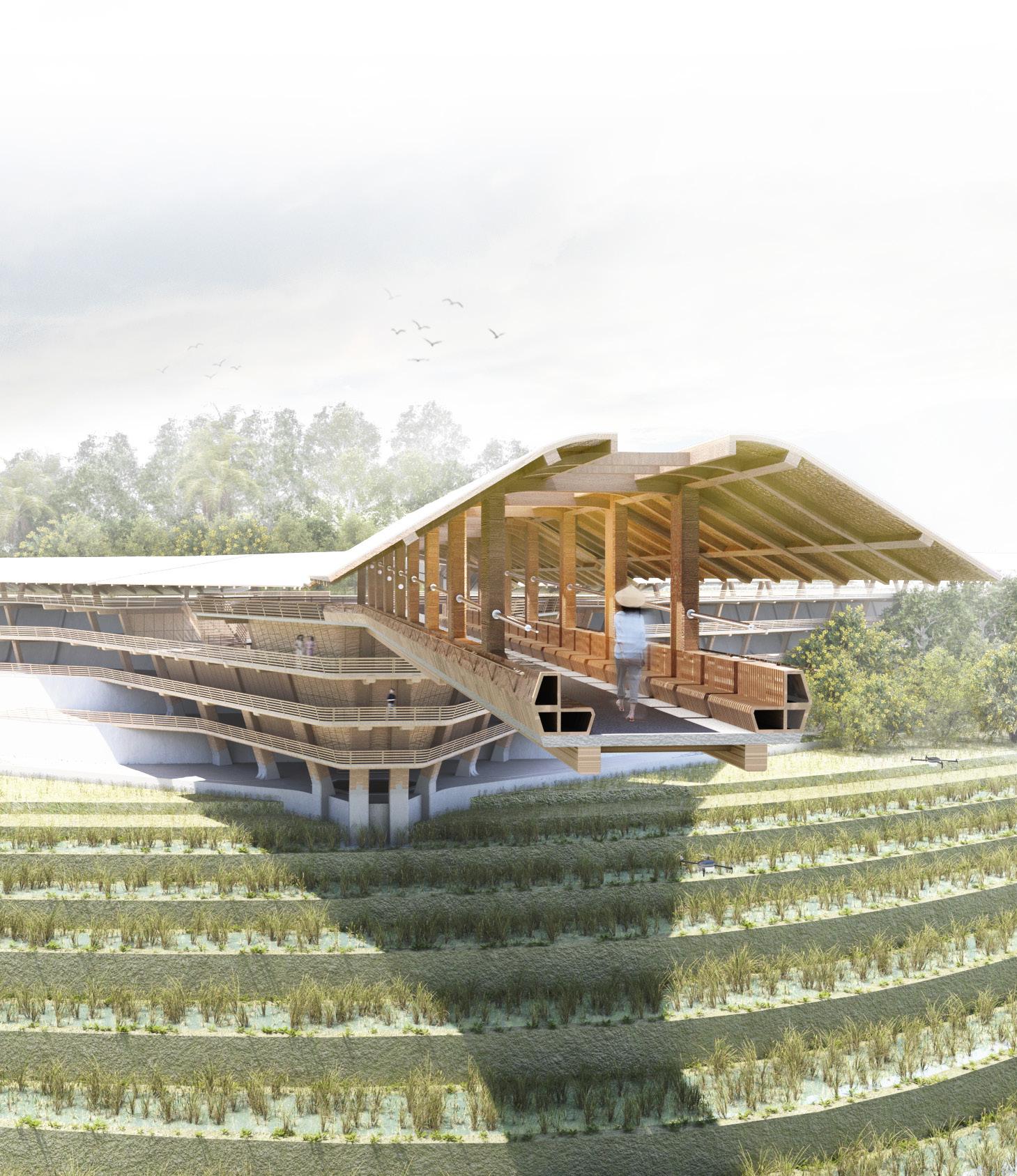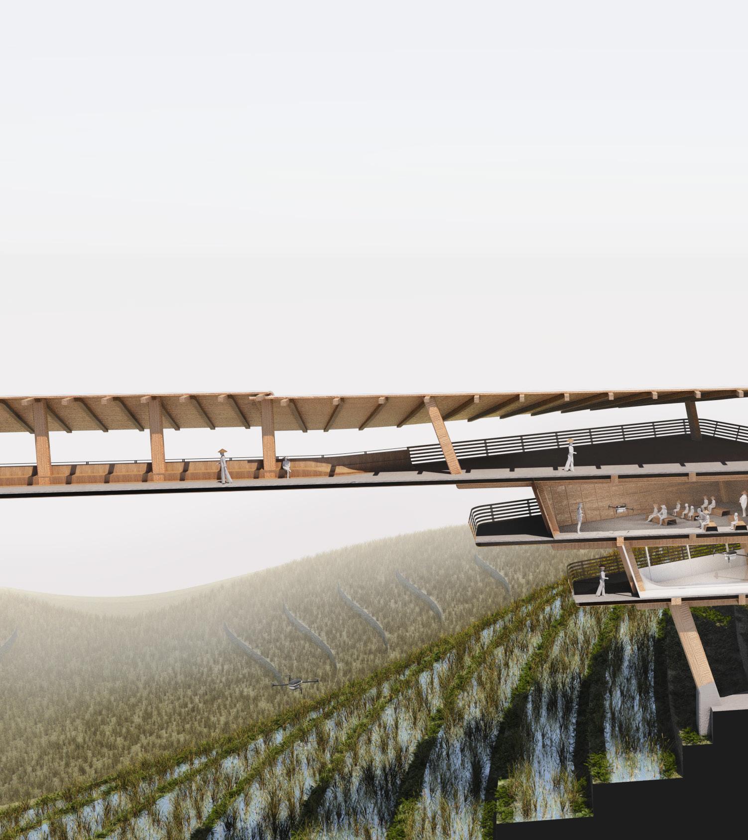 Agronomy Strata serves as a means to respond to existing indigenous Vietnamese communities facing climatic challenges within their environment. The building readapts vernacular methods of construction to build large-scale cantilevered floor plates that extend from the sloped context.