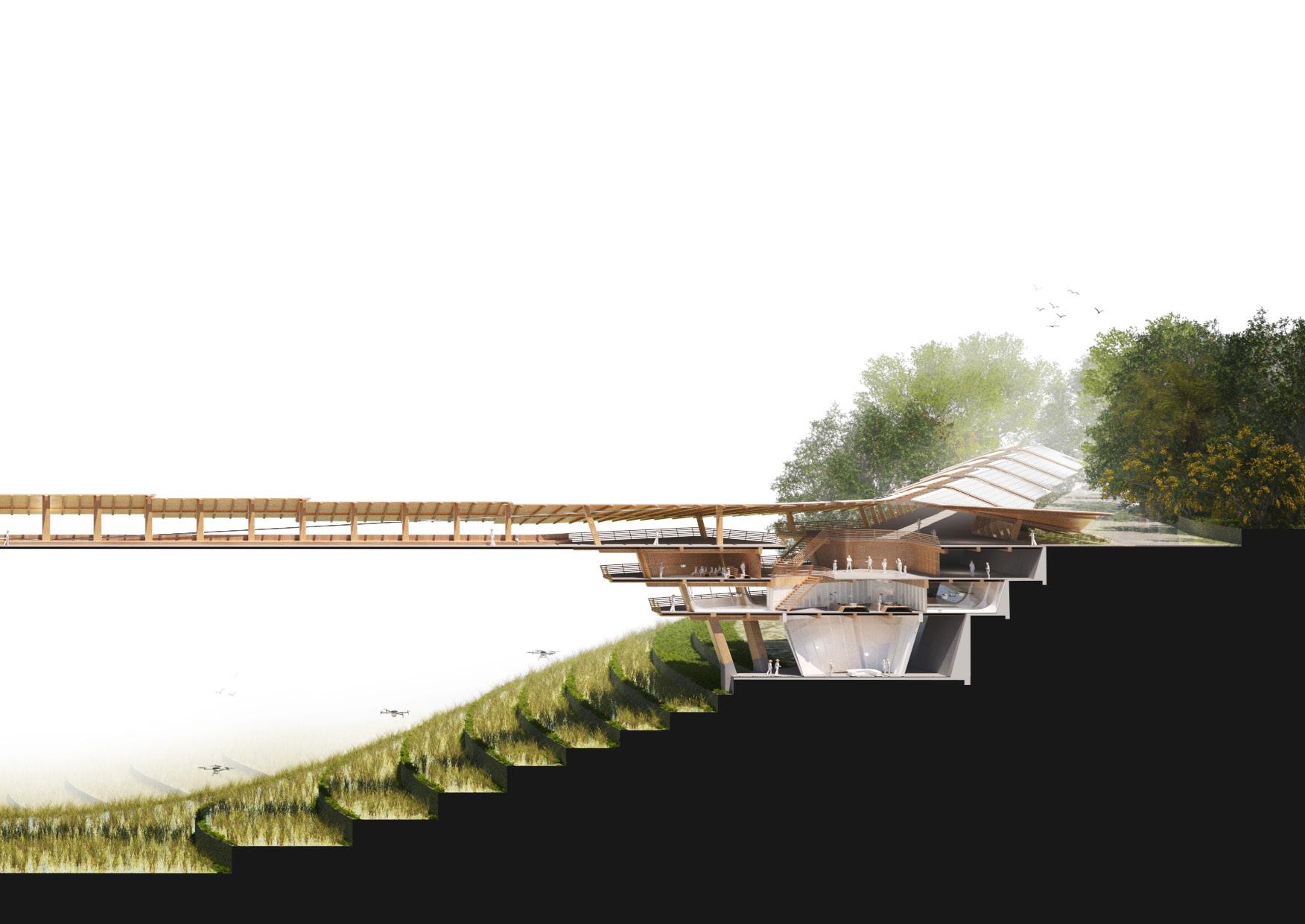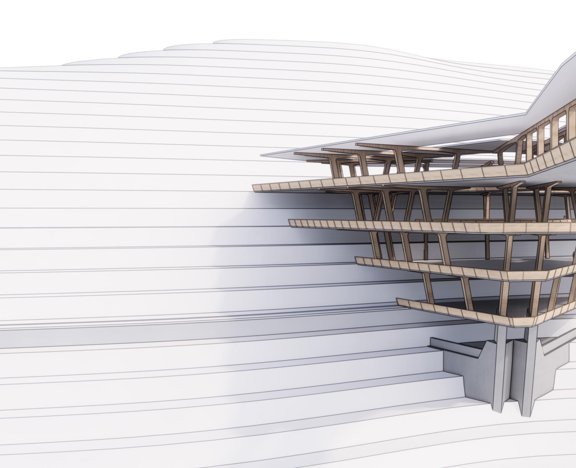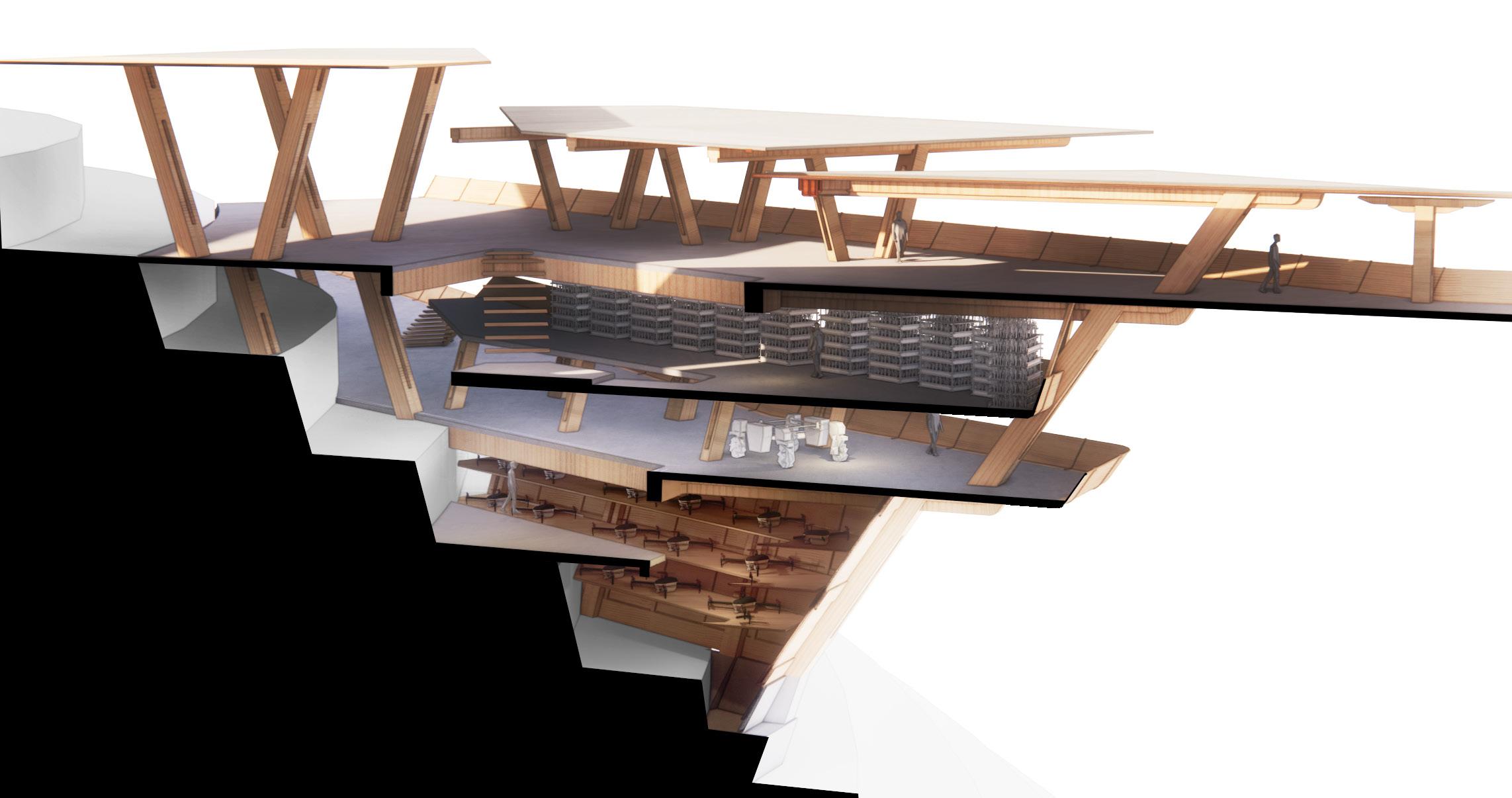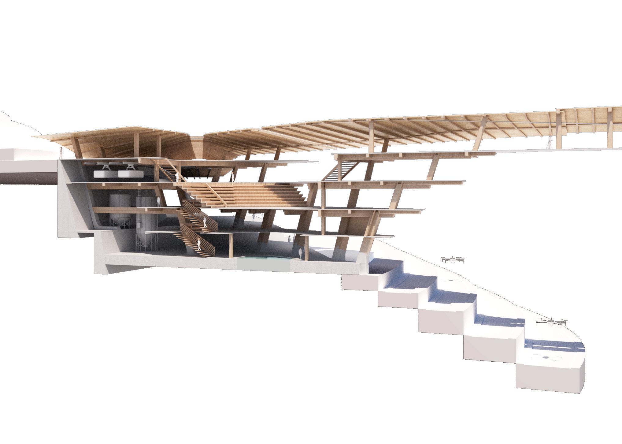 Agronomy Strata serves as a means to respond to existing indigenous Vietnamese communities facing climatic challenges within their environment. The building readapts vernacular methods of construction to build large-scale cantilevered floor plates that extend from the sloped context.