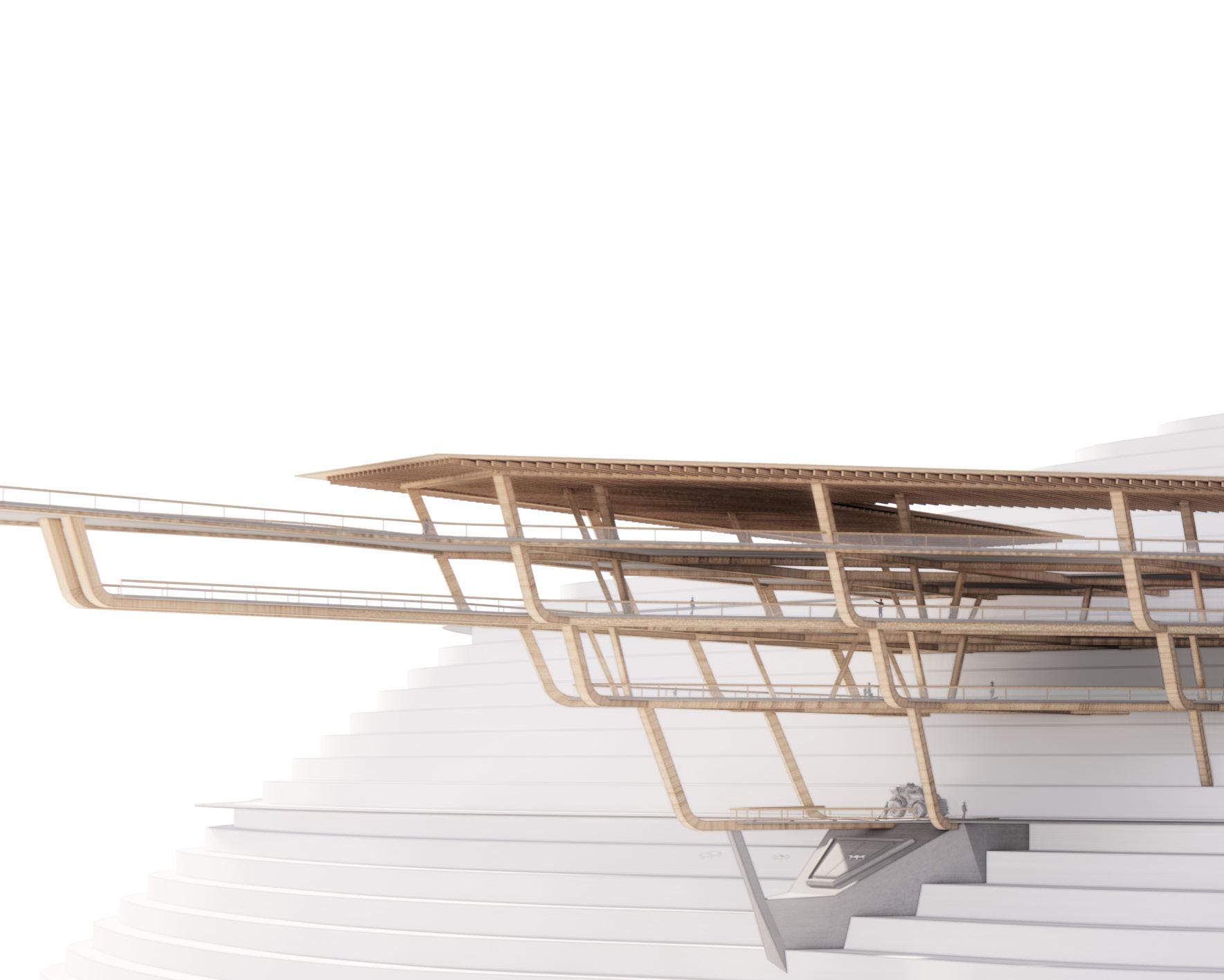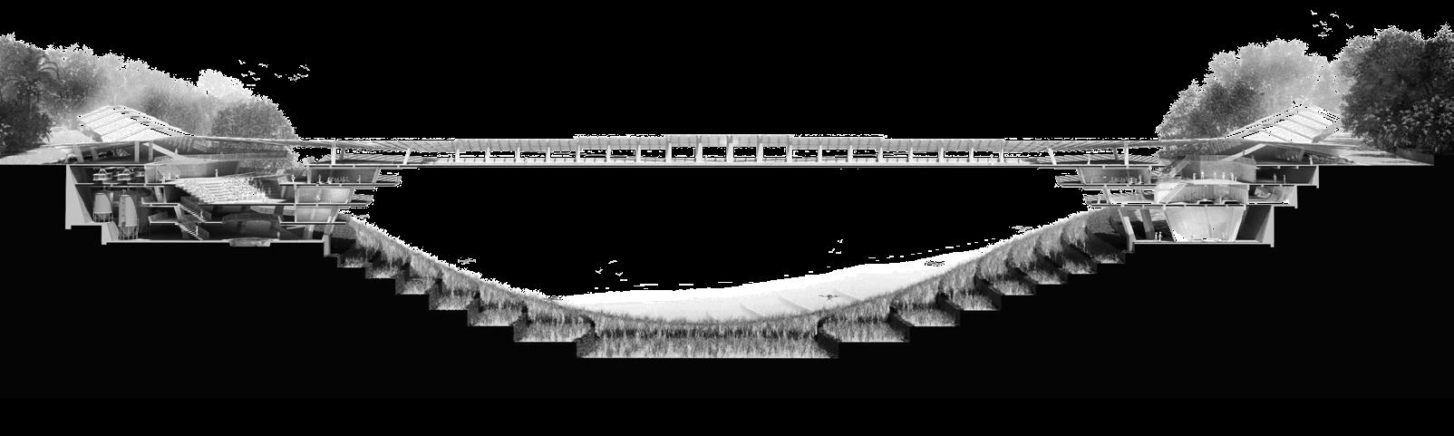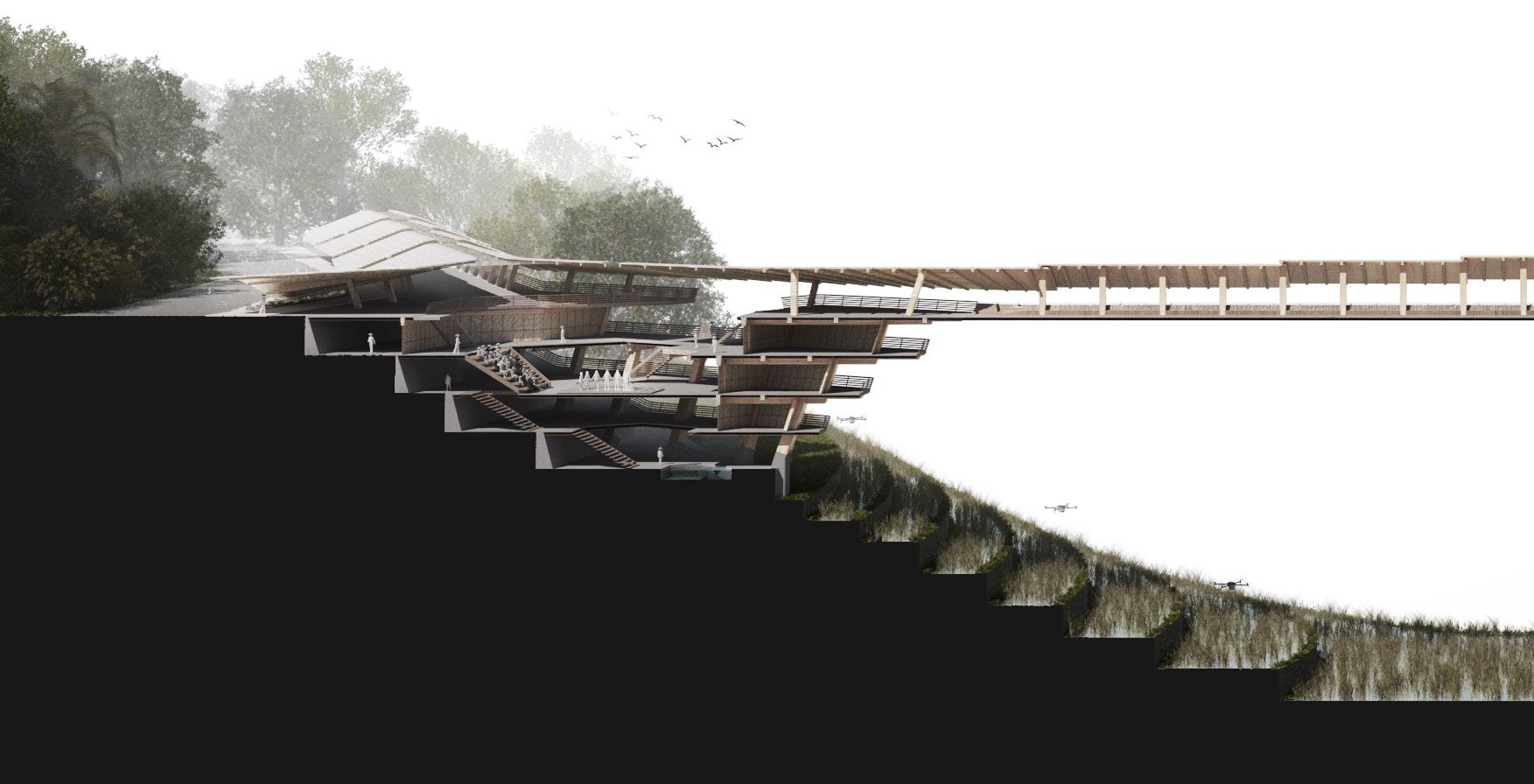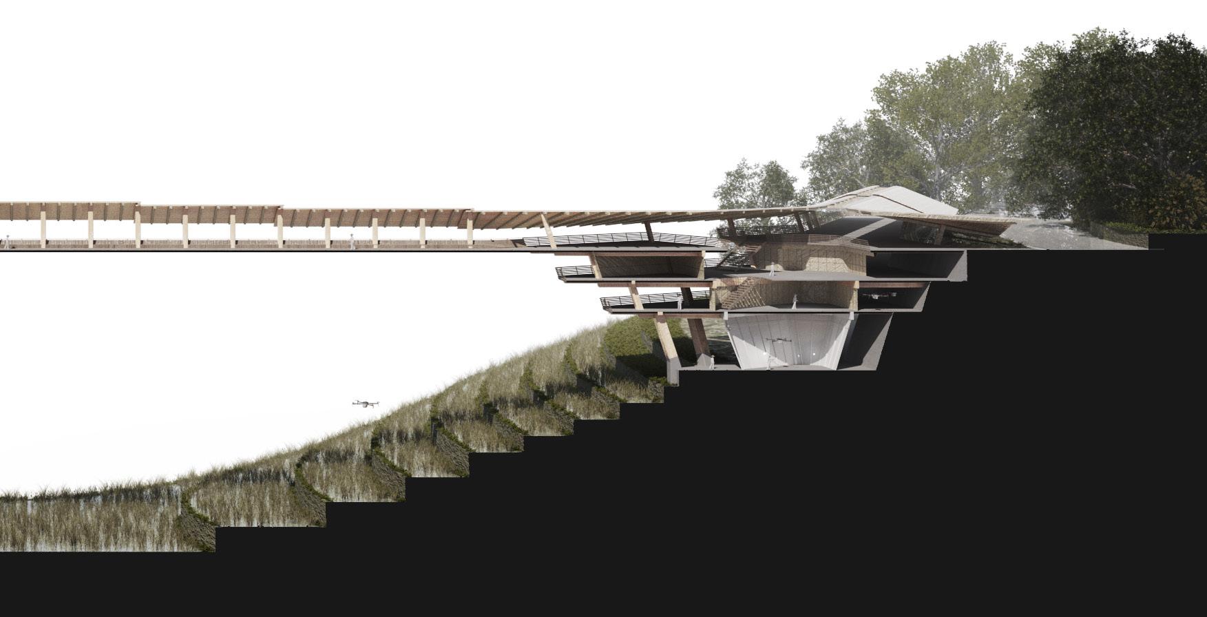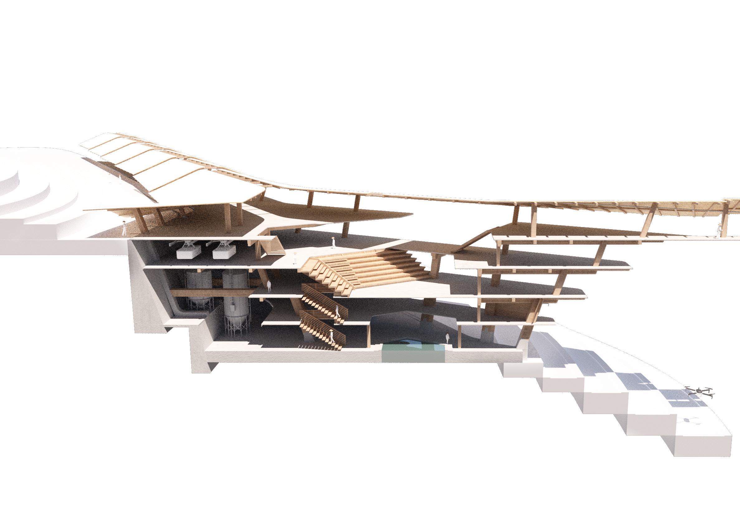 Agronomy Strata serves as a means to respond to existing indigenous Vietnamese communities facing climatic challenges within their environment. The building readapts vernacular methods of construction to build large-scale cantilevered floor plates that extend from the sloped context.