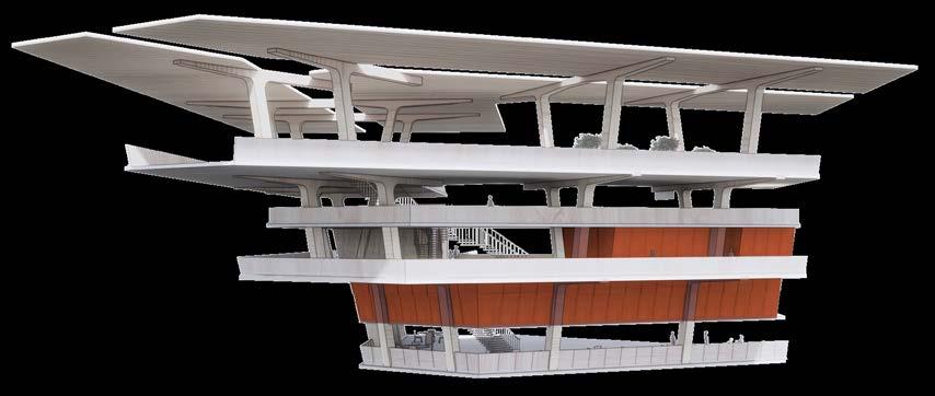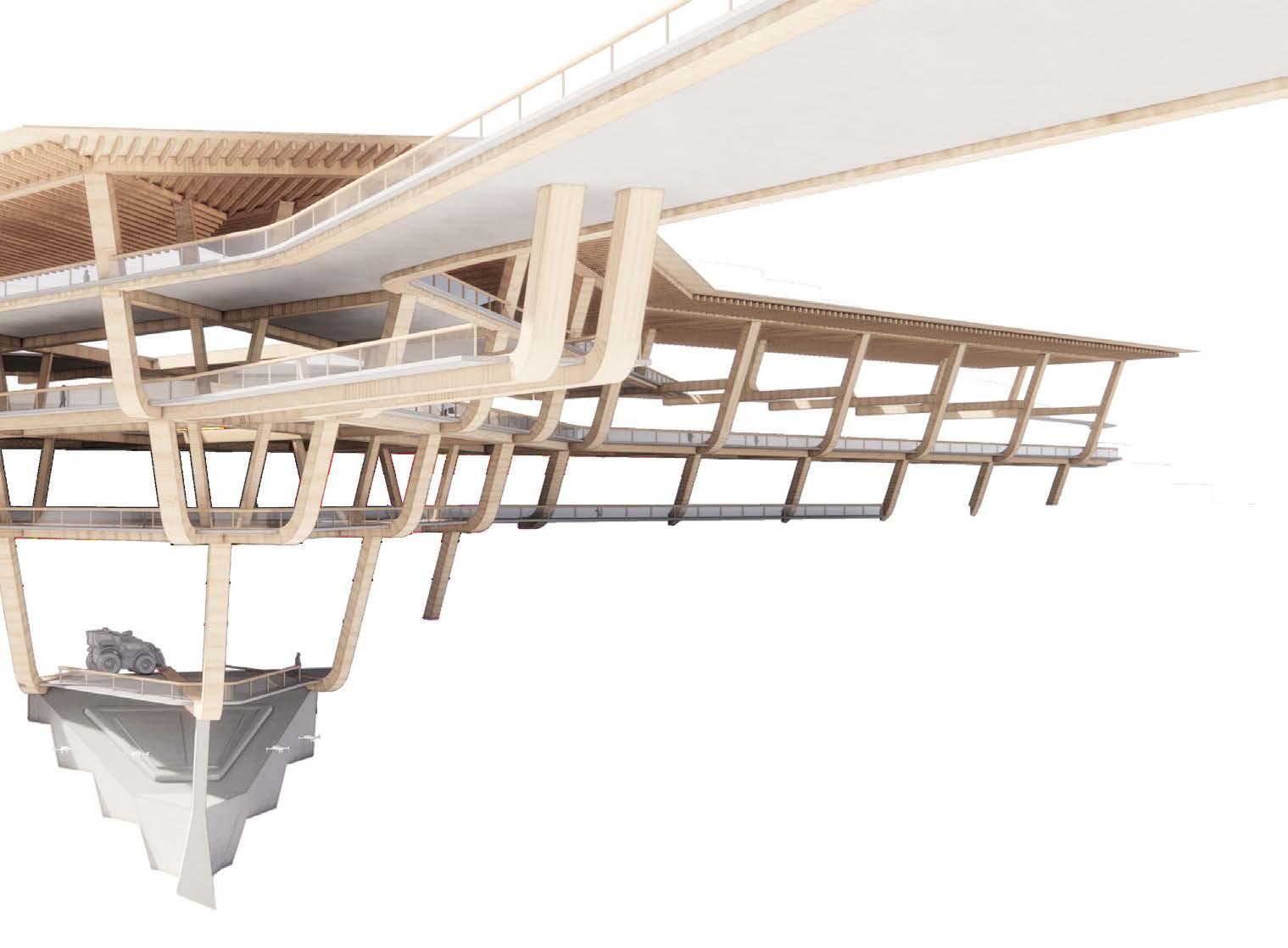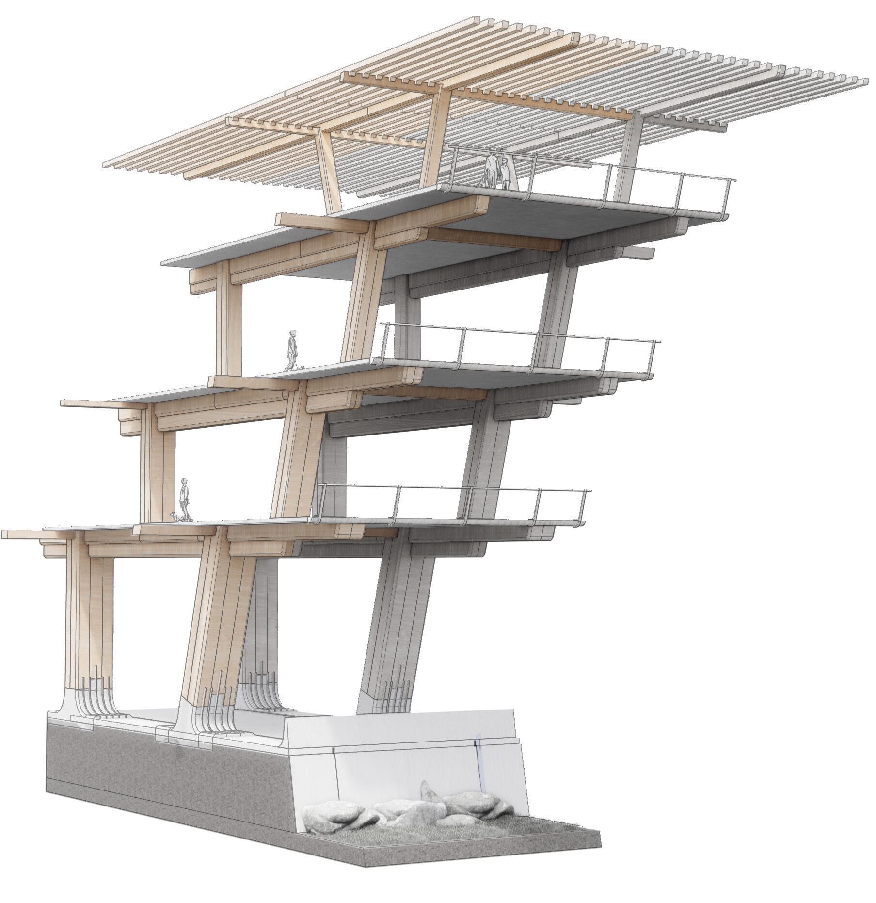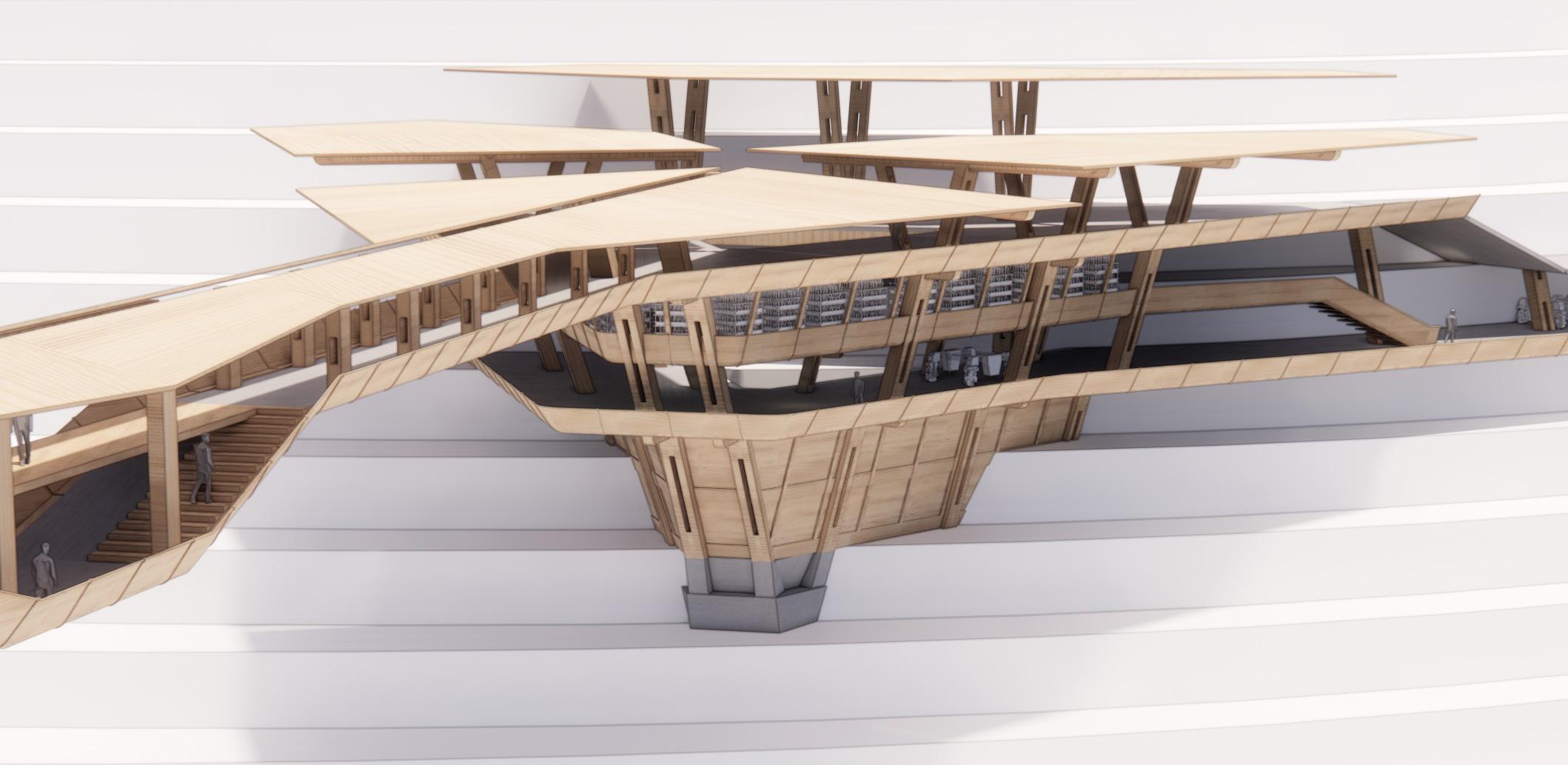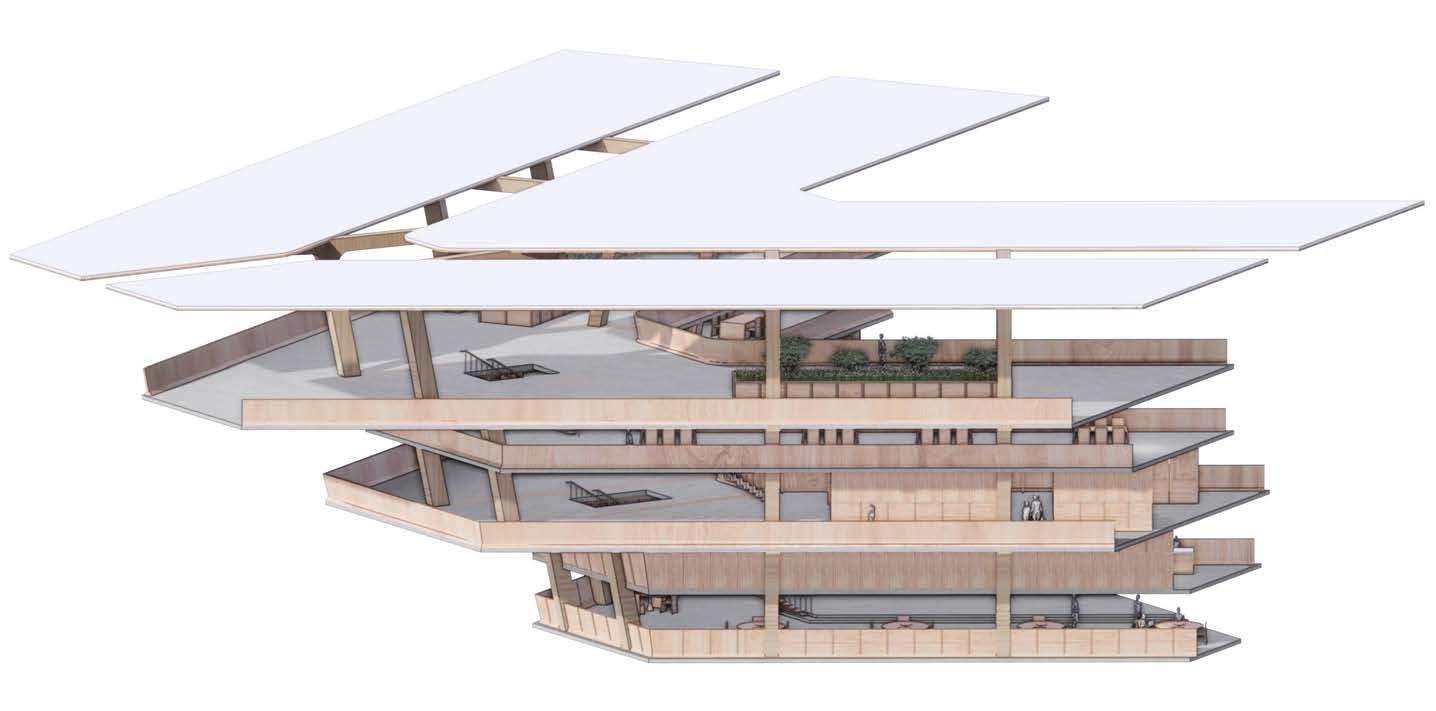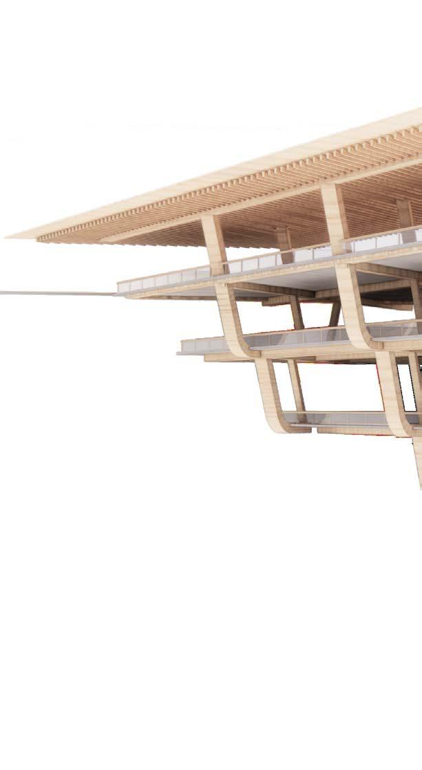 Agronomy Strata serves as a means to respond to existing indigenous Vietnamese communities facing climatic challenges within their environment. The building readapts vernacular methods of construction to build large-scale cantilevered floor plates that extend from the sloped context.