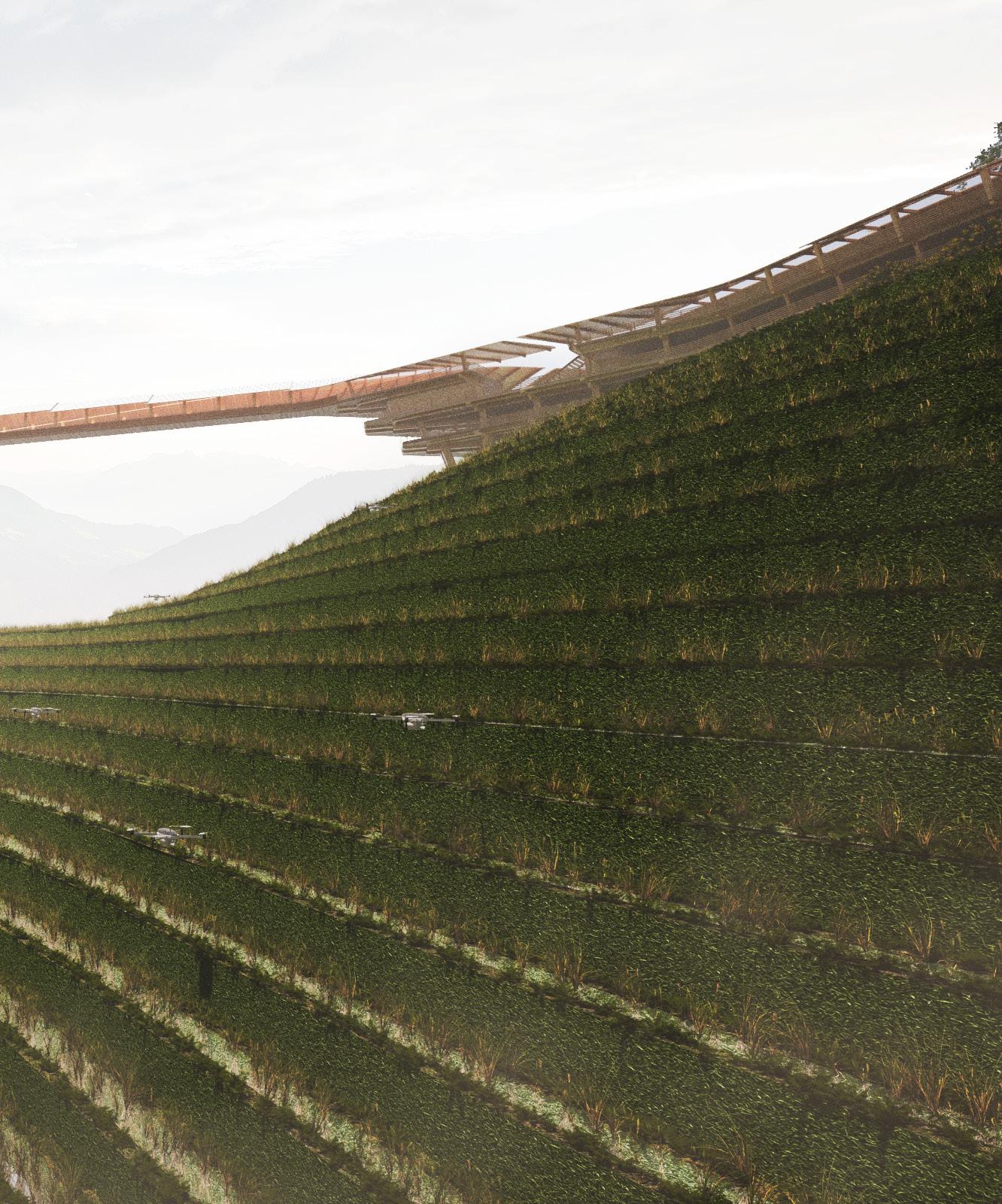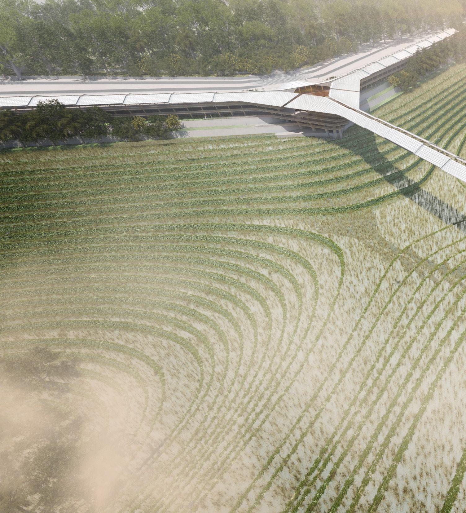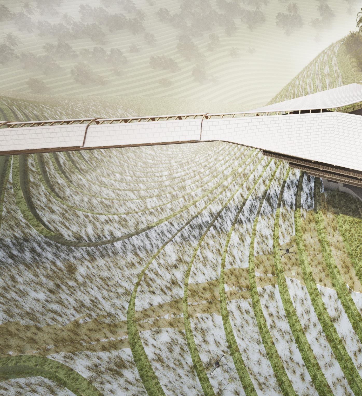 At the heart of the design is the integration of agritech, which revolutionises traditional farming practices and empowers local farmers with innovative tools for land management. By harnessing the power of automated systems to care for the land, a symbiotic relationship is created between nature and civilisation, where the bounty of the earth sustains and enriches