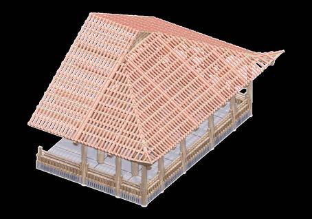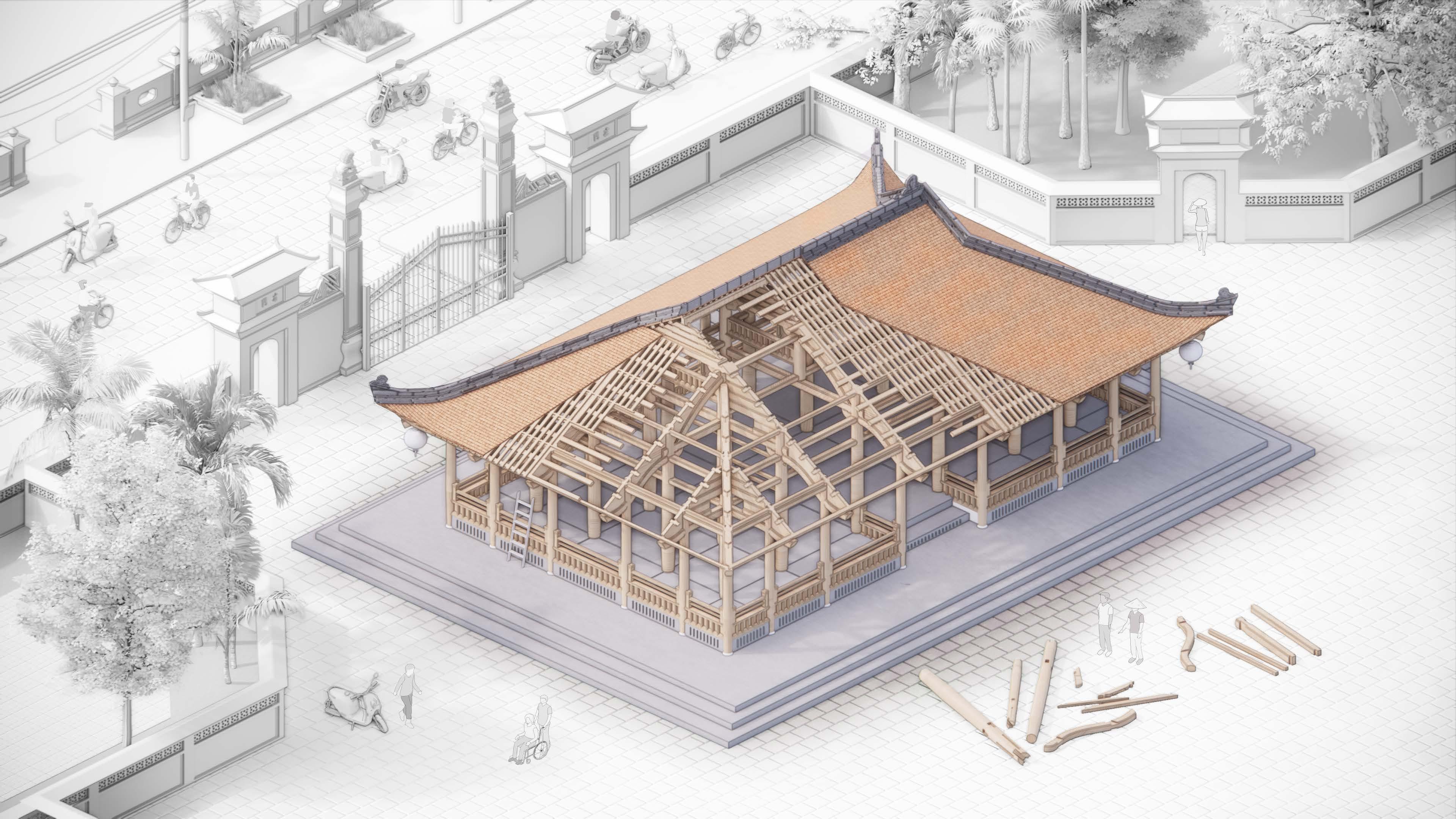 Dating back to the fourteenth century, the quintessential Vietnamese structural system replaced the Chinese truss and has since undergone a change in style and form. The roof holds a 2:3 roof and 1:3 body ratio, which has a strong impression of a heavy roof to provide shelter in extreme conditions.