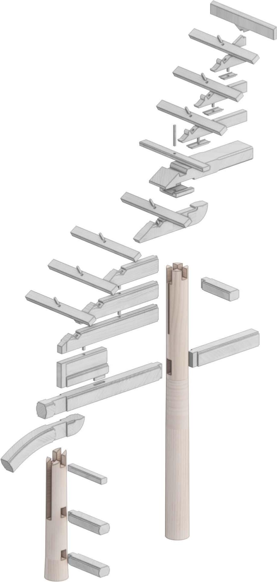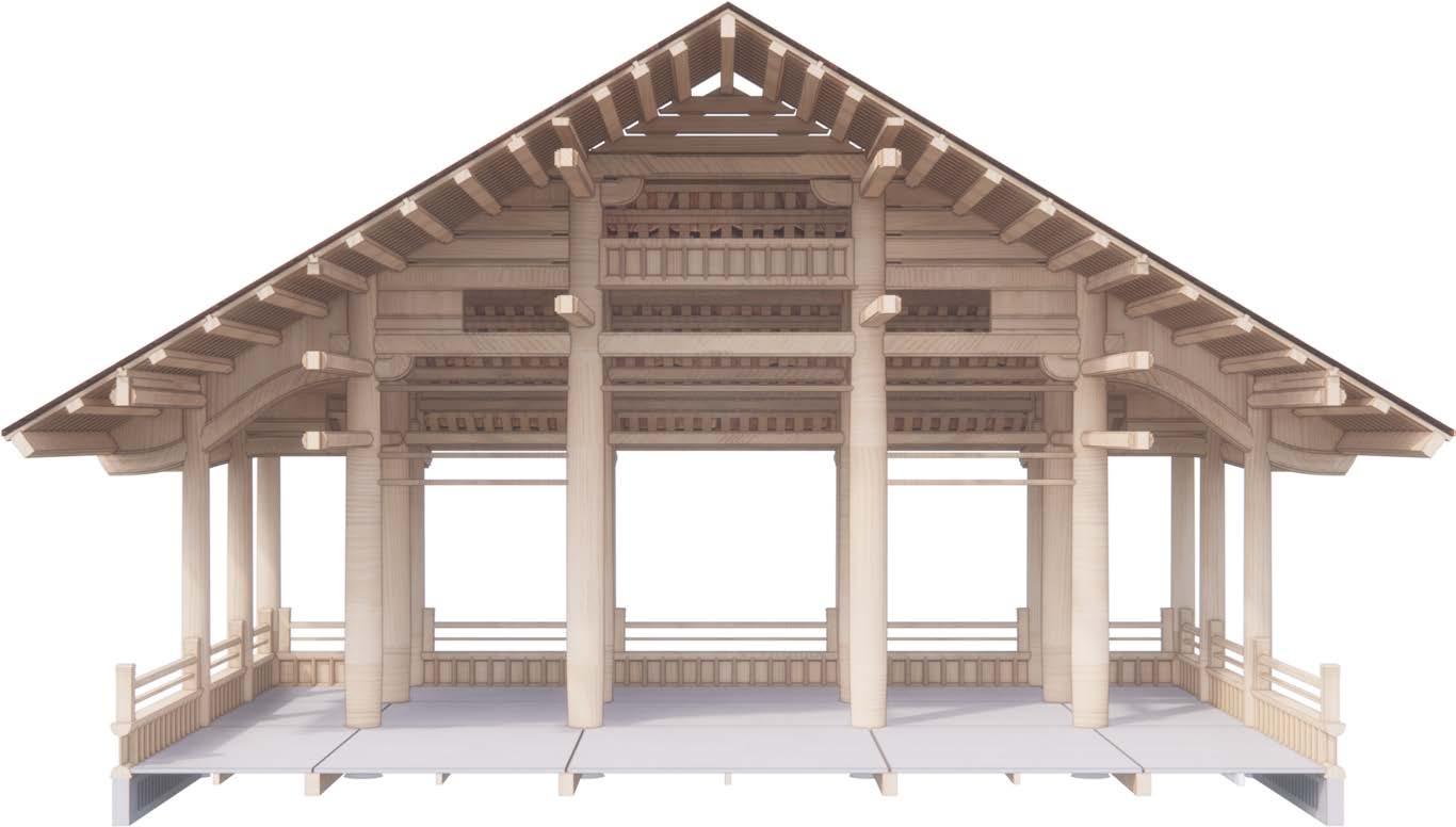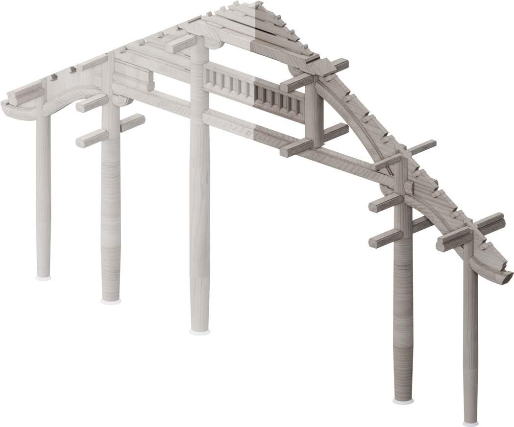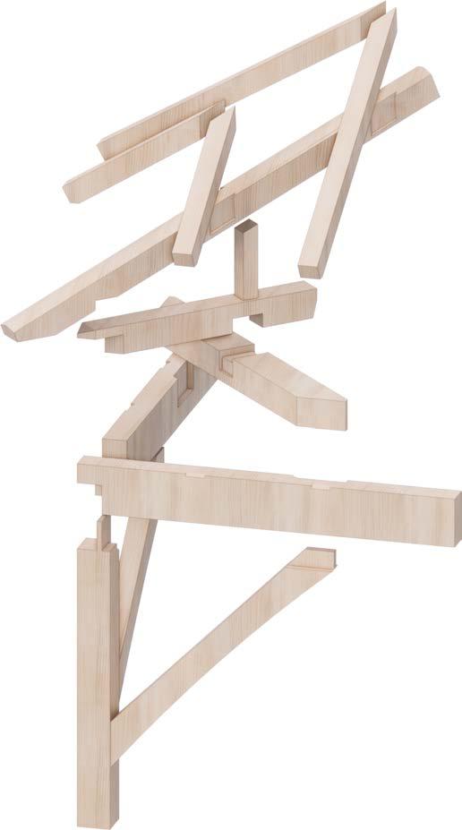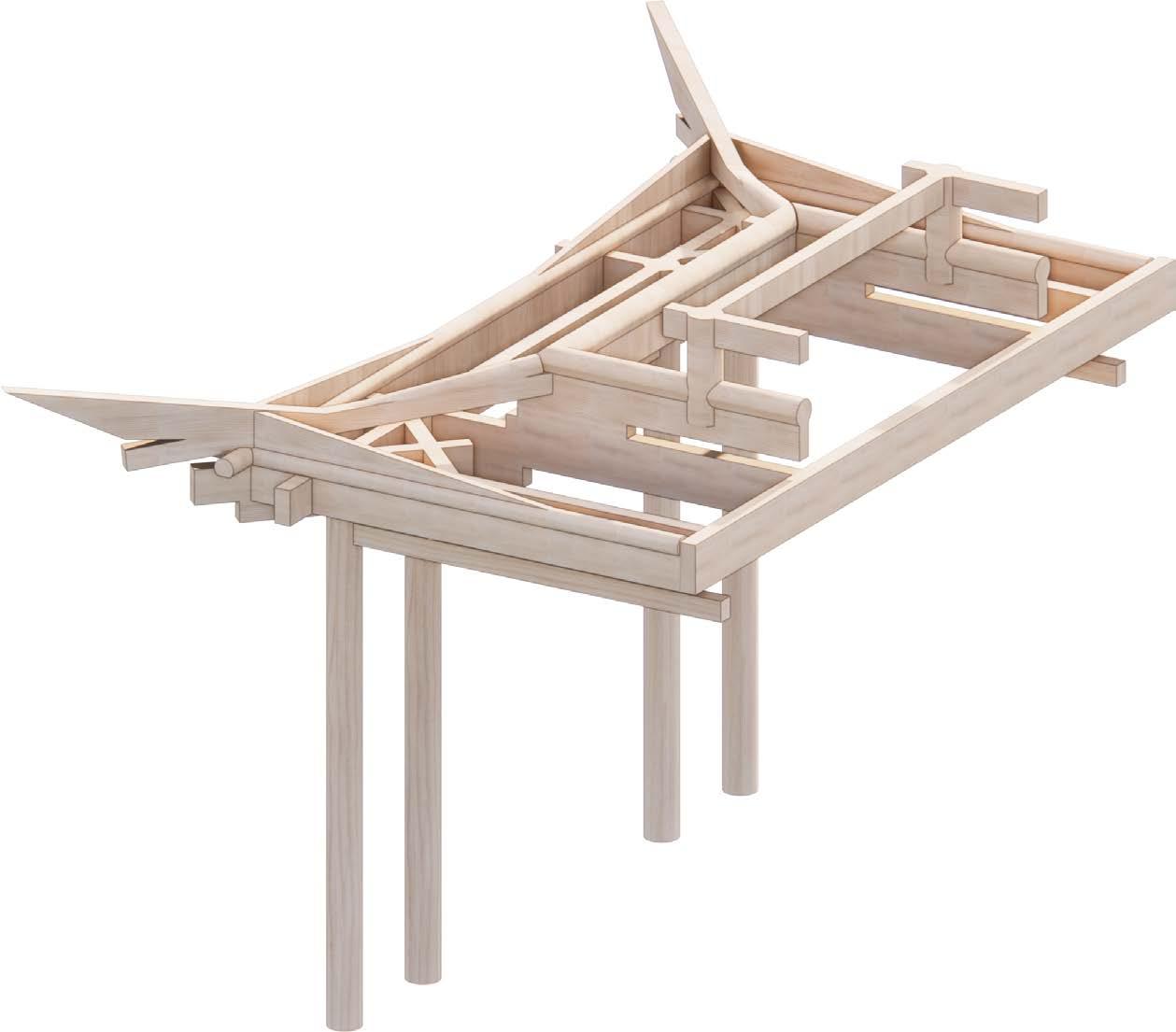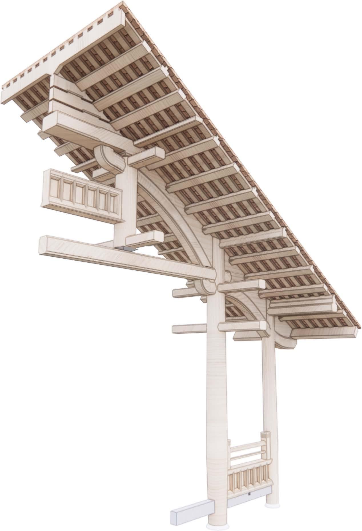 4. Brackets (sandals) and horizontal rafters are installed to create flying eaves shape.