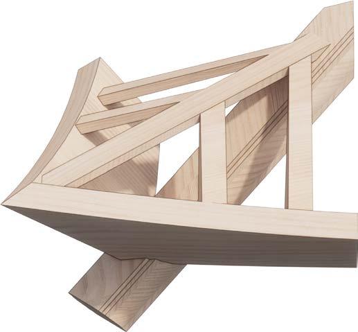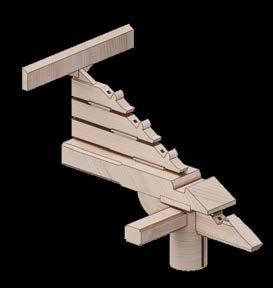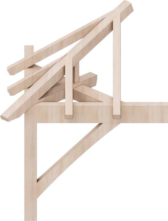 Bracing is utilised similarly to the traditional eaves. In this instance, the joinery braces the branch but also allows for the extension of the fly beam.