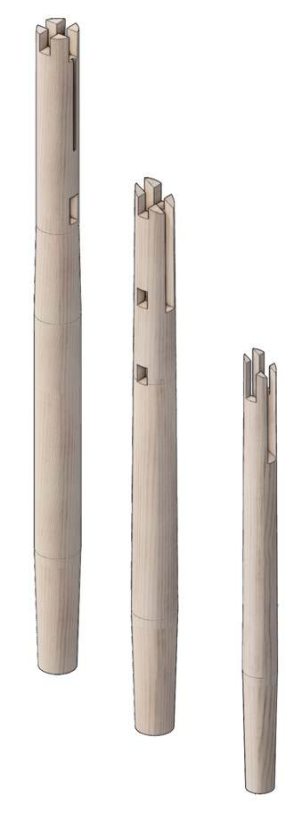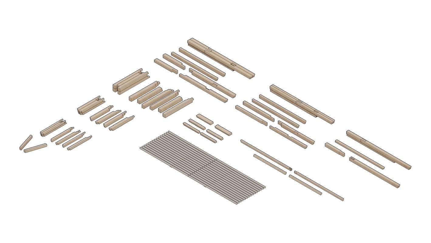 This deliberate orientation ensures that when vertical loads, such as those exerted by the roof, are applied, the bundling of timber pieces functions similarly to a glue-laminated timber piece, effectively resisting compression parallel to the grain.