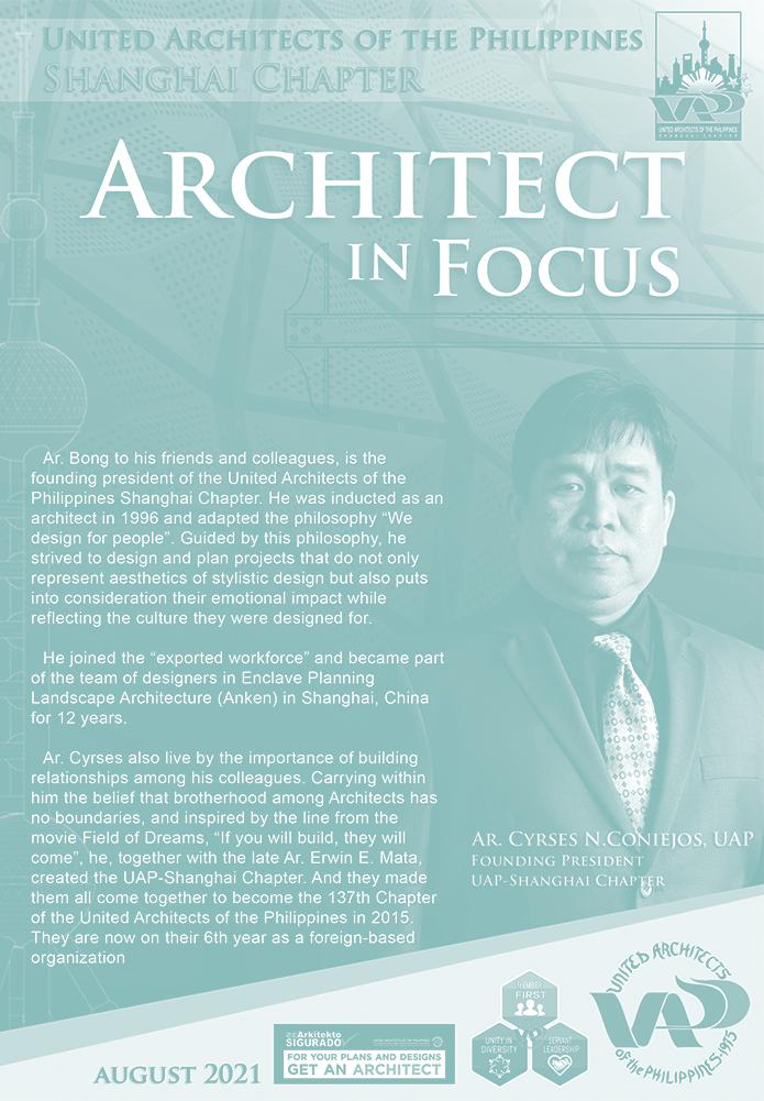 uniqueness that each architect brings into his or her own practice. Among the first members to be featured are UAP Shanghai Chapter’s Founding President, Ar. Cyrses N. Coniejos and past chapter president Ar. Edgardo T. Budoy. Both of them share the same passion for the profession but expressed them differently as seen in their individual works and projects.