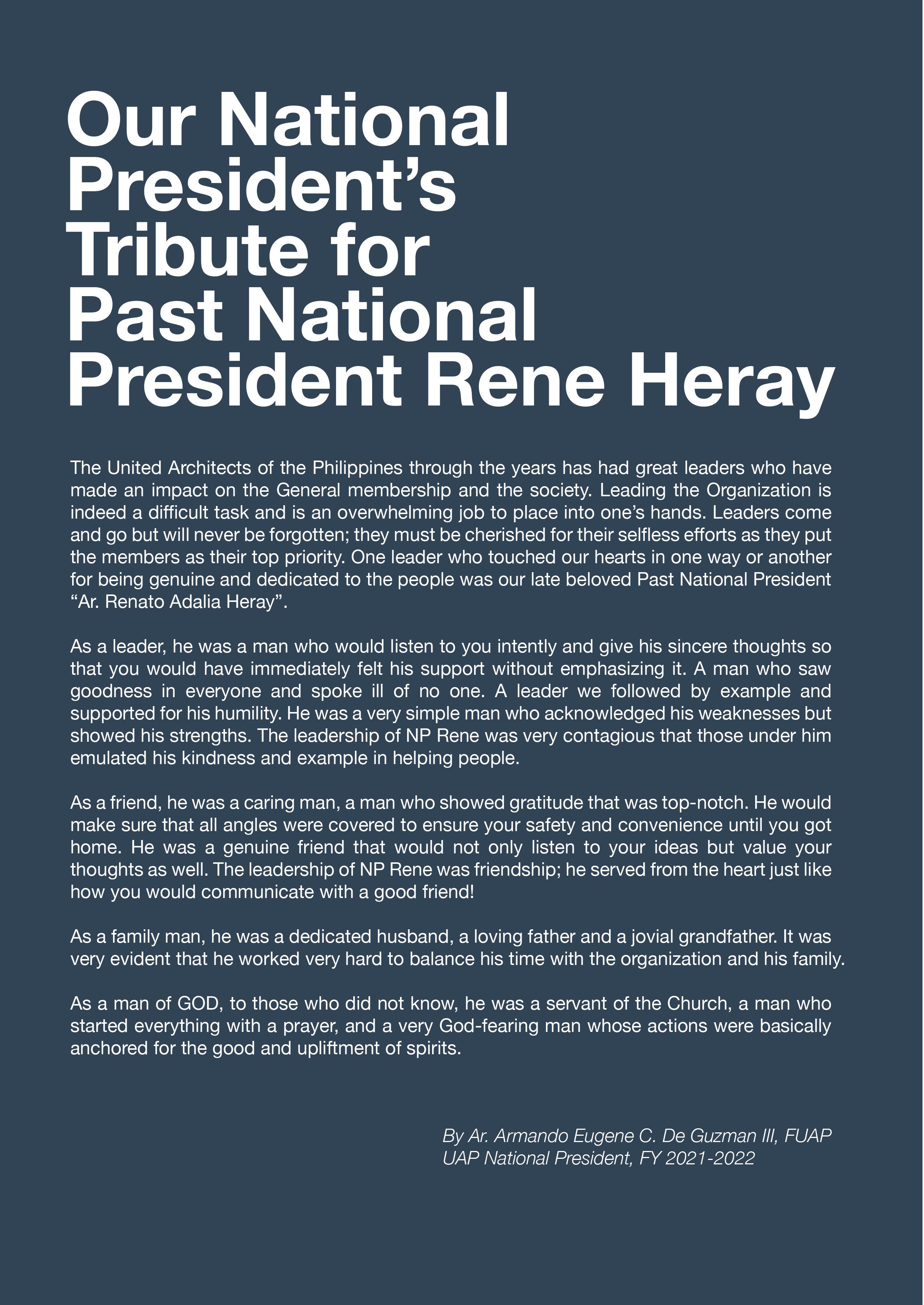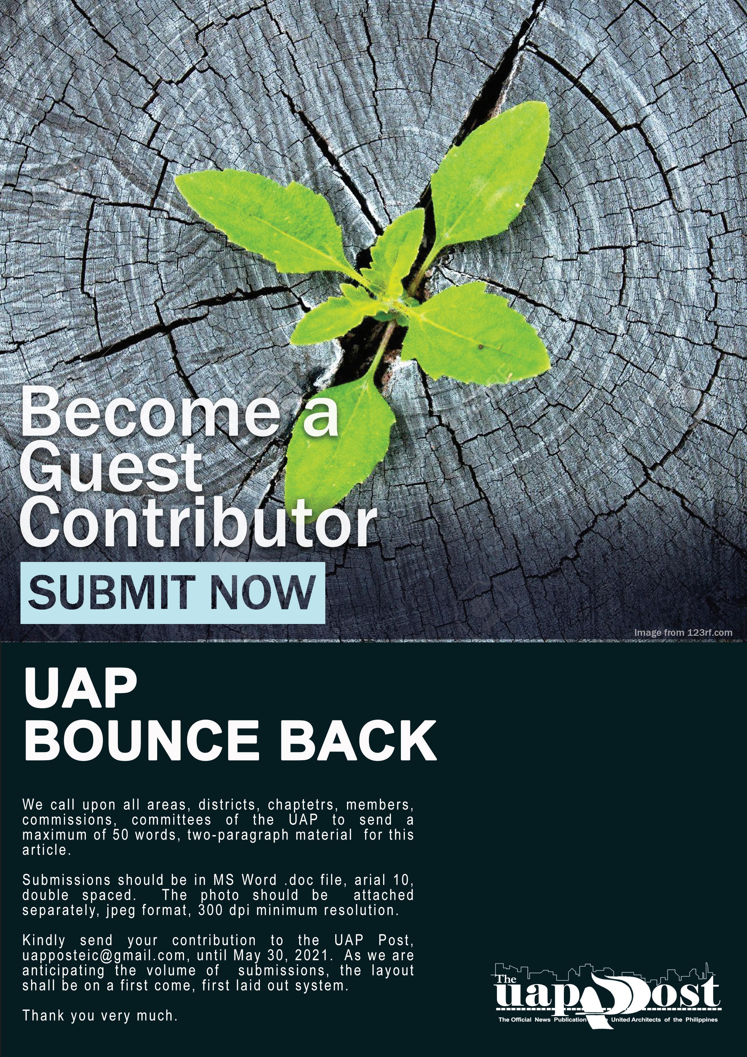 The UAP journal has inherent opportunities as the official repository, publication and exhibition reading material for the creative expressions of Filipino architects in the Philippines and in global stage. In the fiscal year 2021-2022, we aim to realize this potential through a more robust content and wider circulation to general membership and industry partners. This year (2021-2022), the UAP Professional Development Commission through the Committee on Publications is re-launching the UAP Journal. The new journal will now be branded as “Arquitektura”.