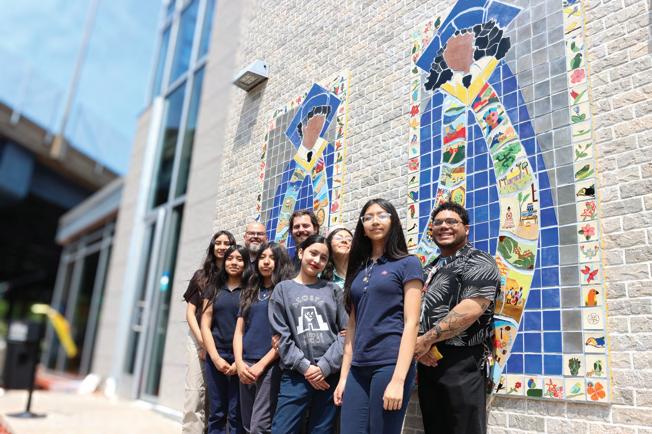 Simultaneously, students at UCC Acosta Middle School have been deeply engaged in the creation of a new ceramic tile mural titled, “Gracias a Nuestros Antecedentes, Somos el Futuro” (Thanks to Our Ancestors, We Are the Future). A collaborative project with Latino Arts, Inc., La Familia de Arte, and Acosta students, led by art teacher Mr. Cruz, this mural lives on the south exterior wall of Acosta Middle School, facing Washington Avenue, serving as both a visual landmark and a cultural welcome to the school and neighborhood.