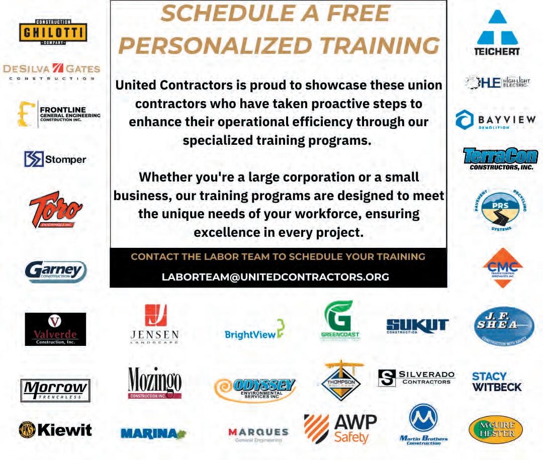 JUAN ARREQUIN, BAY LINE CUTTING & CORING, INC. (PAST SECRETARY/ TREASURER); TOM BARR, GHILOTTI BROS., INC.; BRYN BURKE, DEES BURKE ENGINEERING CONSTRUCTORS, LLC; SEAN CASTILLO, TORO ENTERPRISES, INC.; DERMOT FALLON, FOUNDATION CONSTRUCTORS, INC.; RITA VIGIL FERGUSON, G & F CONCRETE CUTTING, INC.; BRENT FOGG, GRANITE CONSTRUCTION COMPANY; MICHAEL GATES, DESILVA GATES CONSTRUCTION, LLC; KEVIN HESTER, MCGUIRE HESTER (PAST PRESIDENT, 2024); MATT LOVINGIER, JMH ENGINEERING & CONSTRUCTION, INC.; DANIEL RODRIGUEZ, BAY CITIES PAVING & GRADING, INC.; KEVIN REIMERS, WOODRUFF-SAWYER & CO. (ASSOCIATE DIRECTOR); ELIZABETH TORREZ, TENNA (ASSOCIATE DIRECTOR-ELECT)