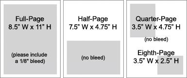 All advertisements must be submitted electronically via DropBox file request, be formatted correctly in accordance with the size chart above and be submitted as a 300DPI JPEG file.