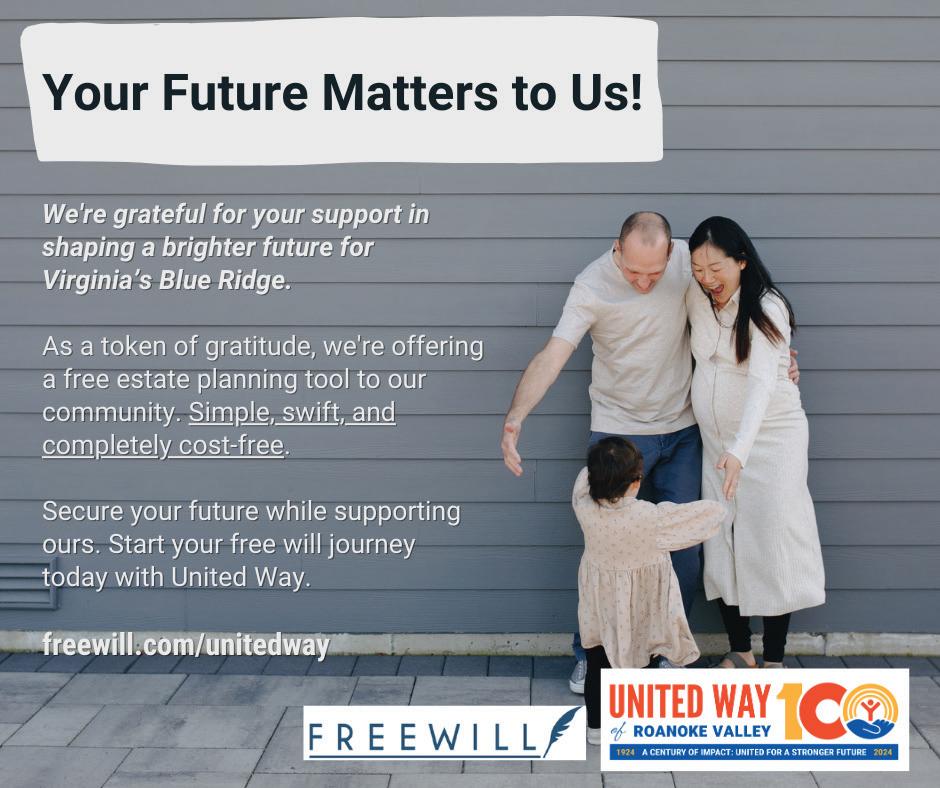 Leave a thoughtful gift in your estate plans. Simply instruct your attorney to include United Way of Roanoke Valley as a beneficiary. Don’t have a will? Go to https://www.freewill.com/UnitedWay to use our free tool.