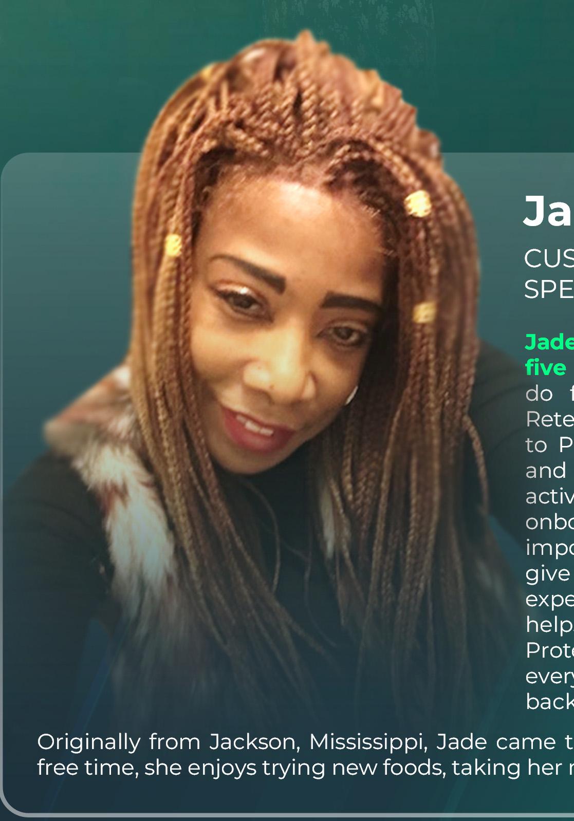 Jade T CUSTOMER SERVICE RETENTION SPECIALIST JadehasbeenwithUCESformorethan fiveyears andsays,“IabsolutelylovewhatI doforthecompany.”Herpositionasa RetentionSpecialistrequireshertoreachout toProtectionPlancustomerswithawarm andfriendlywelcomeasshehelpsthem activatetheirservicesandscheduletheir onboardingcalls.Jadepointsoutthe importanceofonboardingcallsbecausethey givecustomersanunderstandingofwhatto expectfromtheservices.Givingthemclarity helpscustomersgetthemostfromthe ProtectionPlan.“TheProtectionPlanoffers everythingneededtogetcreditandfinances backontrack.”SaysJade.