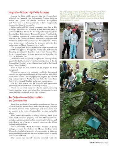 Two Centers Devoted to Sustainability and Communication Doug Fox, professor of sustainable agriculture and director of the Center for Sustainability and Global Change, has seen his center blossom with partnerships and associations that are squarely at the nexus of sustainability practice and public affairs. His Center is involved in an energy efficiency block grant and a wind assessment program, both with Efficiency Maine, an independent trust dedicated to promoting the efficient and cost-effective use of energy in order to save money for Maine residents and businesses. The Community Wind Assessment Program at Unity College, overseen by Professor of Human Ecology Mick Womersley, has helped a number of communities in Maine to assess whether proposed sites for wind turbines would be ideally suited to the endeavor. The Center has recently become involved with the UNITY SUMMER 2012 |