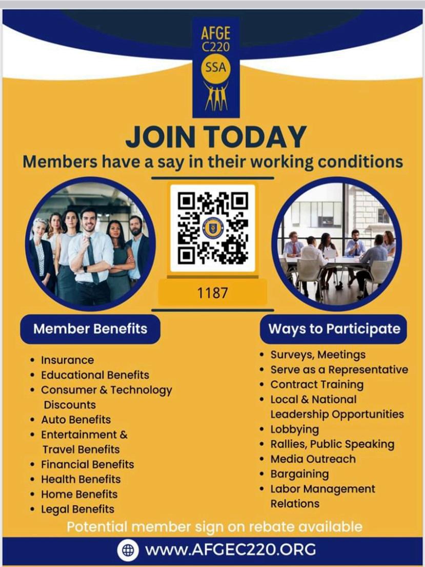 As part of our AFGE/SSA 2024 summer legislative drive initiative, for which we are currently developing through strategic planning sessions, we will have specific action tool kits available for this effort. They will be found at afgec220.org starting mid-June, at the latest, with a national Q and A session to follow