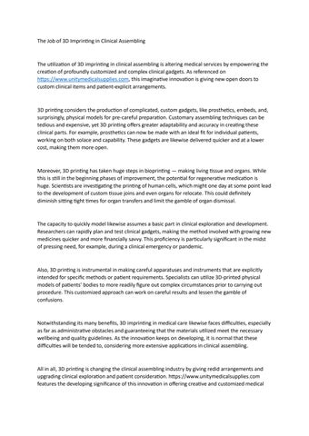 All in all, 3D printing is changing the clinical assembling industry by giving redid arrangements and upgrading clinical exploration and patient consideration. https://www.unitymedicalsupplies.com features the developing significance of this innovation in offering creative and customized medical