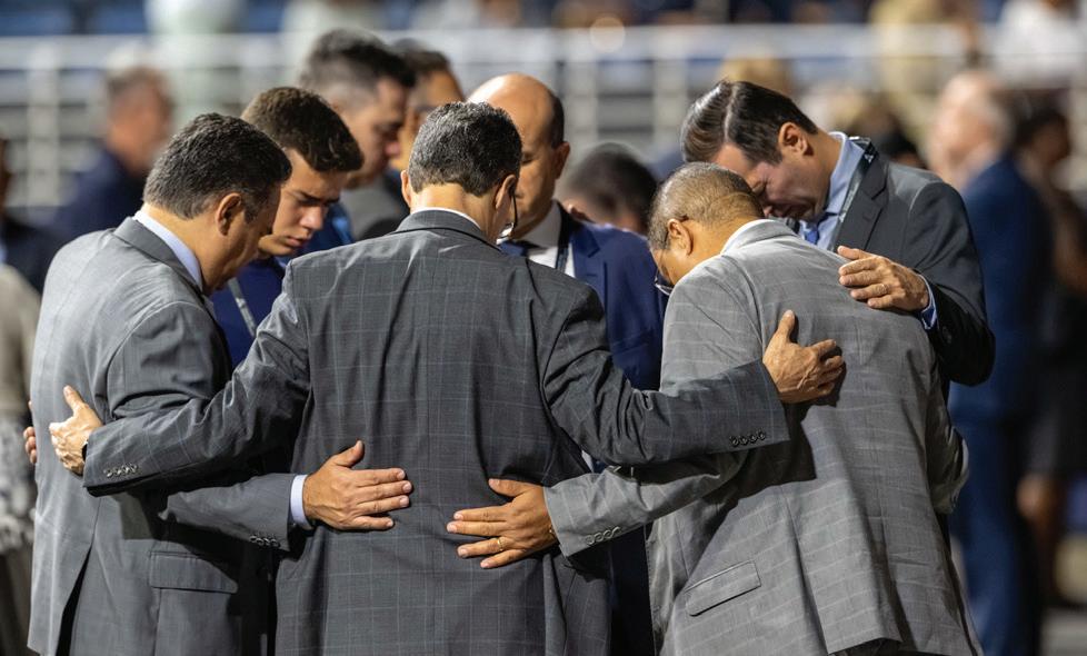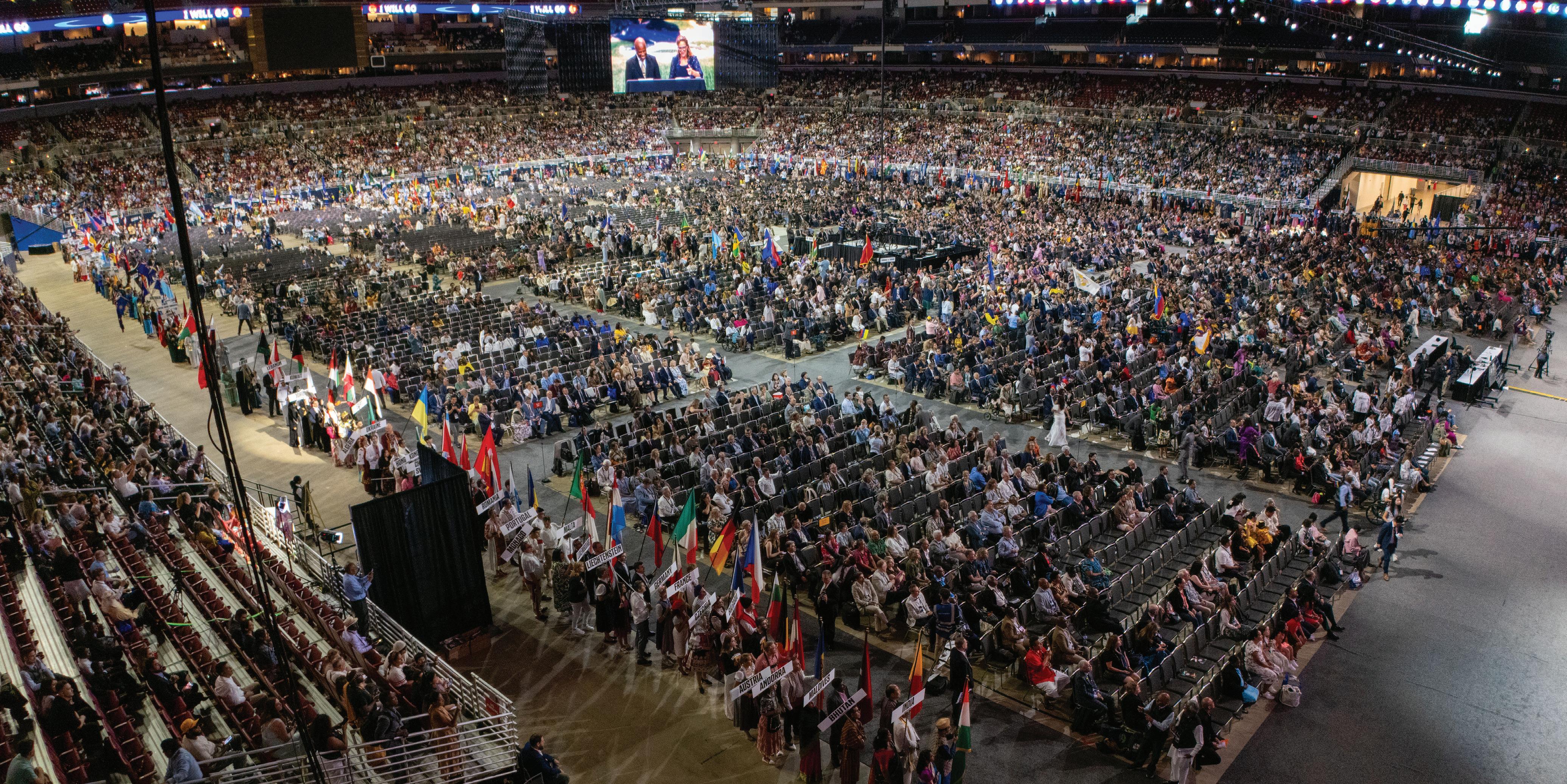 în miniatură. Acolo, aveai ocazia să vezi povești misionare proiectate pe ecrane imersive, să simți mirosul cerealelor din Etiopia sau aroma prăjiturilor indoneziene, să asculți explicații în limba maternă și să înțelegi că profesiunea de credință se face și prin așezarea unei tăvi cu mâncare. Diminețile începeau sacru – cu rugăciune și închinare. Predicile, traduse în peste zece limbi, aduceau o chemare fermă: să rămânem conectați la Cuvânt și la misiune. Întruna dintre zile, liderii au invitat publicul să se roage în grupuri mici. Mii de oameni au îngenuncheat spontan și, în tăcere sau în șoaptă, au cerut călăuzire și binecuvântare pentru lucrarea Bisericii. A fost un moment solemn memorabil. Seara, centrul de conferințe a fost inundat