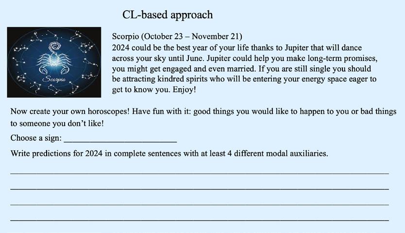 The didactic approach derived from cognitive linguistics is based on experimental studies which show that when students take part in fun activities set in a relevant cultural context, they learn more effectively than with traditional teaching. For example, we could ask students to listen to a contemporary song and read the written lyrics in which the modals have been removed. Once they have identified the modals, we could discuss the lyrics, explaining the meanings of the modals, then ask them to rewrite the song, suggesting other modals and discussing how this would this change the song’s lyrics.
