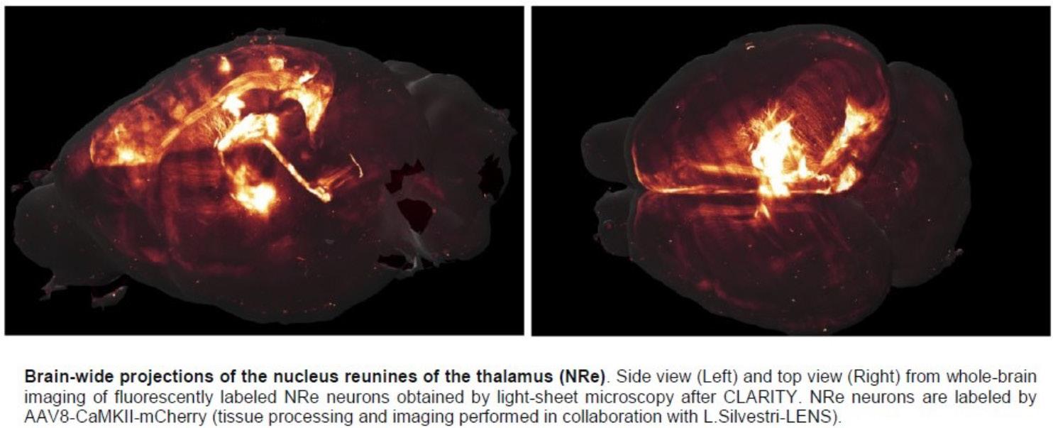 Bianca adds: “My lab analyzes functional brain connectivity using light-sheet microscopy and optogenetic techniques to discover how intense emotional memories can be weakened. Our research focuses particularly on the contribution of neural networks in the medial thalamus that orchestrate the activity of distributed memory circuits in an integrated manner. We are also studying pathological alterations within these thalamocentric circuits in mouse models of fear-related disorders. We aim to identify new strategies for reversing these alterations in fear circuits and pave the way for new therapeutic interventions to treat post-traumatic stress disorder»
