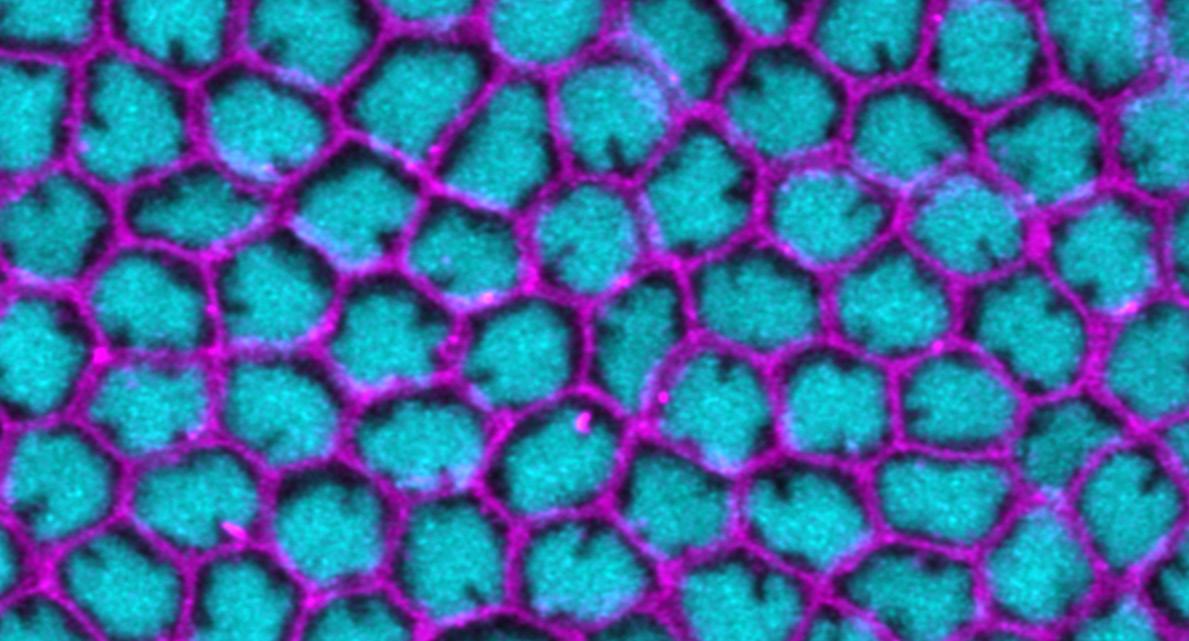 Image microscopique d’un tissu embryonnaire de Drosophila. Les contours des cellules sont marqués en magenta, et les noyaux en cyan, permettant de visualiser leur organisation au sein du tissu