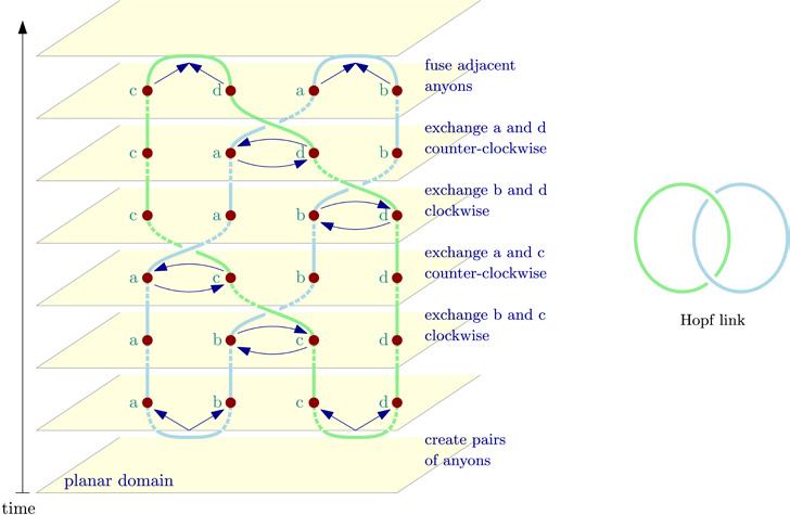 (Gauche) Deux paires d’anyons sont créées dans le plan, leurs positions sont échangées au cours du temps (représenté verticalement) soit dans le sens des aiguilles d’une montre, soit l’inverse, puis les paires sont fusionnées. Au cours de l’expérience, les trajectoires des anyons dans l’espace-temps s’entrelacent pour former un nœud, topologiquement équivalent au nœud de Hopf (Droite). L’état physique du système ne dépend que de la topologie du nœud, c’est à dire qu’il est invariant par déformation du nœud dans l’espace.